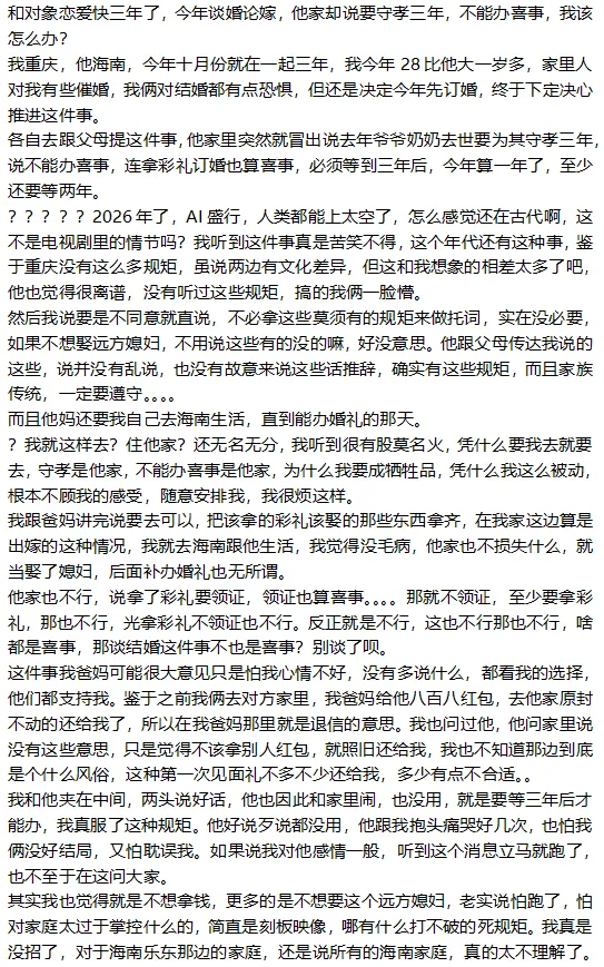 就像你说的,都2026年了,他们好像还在古代。法律没有规定人必须守孝3年才能结婚。