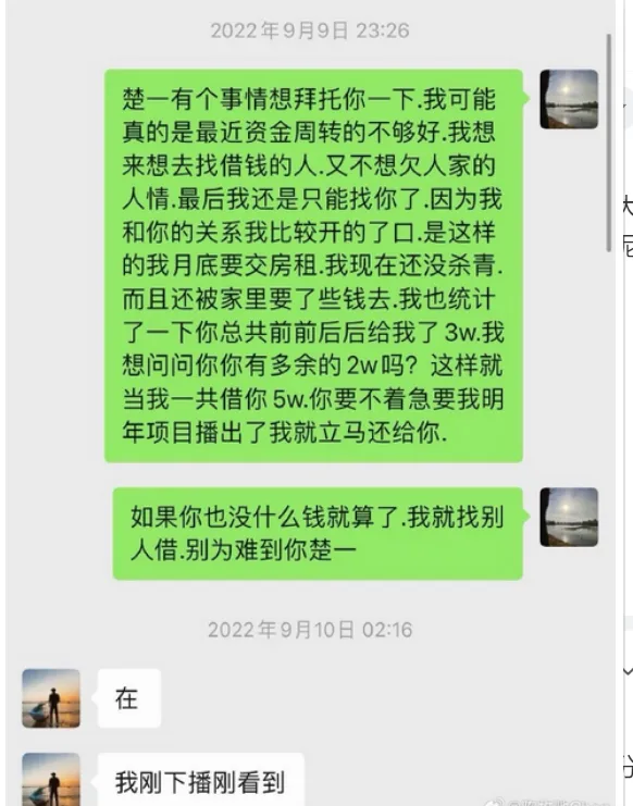 与此同时,吴楚一也在微博上晒出聊天记录和转账凭证,要求陈牧驰公开道歉,认为这场争议对他的生活造成了严重影响。