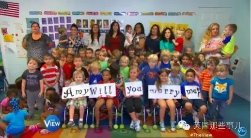 幼儿园中的孩子们举着:“Amy,will you marry me?”的牌子…
