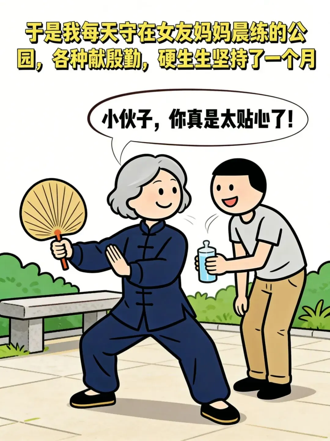 >笑一笑:和女友恋爱两年,可是她爸爸不同意.于是我每天早上都去女友妈妈散步的公园献殷勤,然后各种表现.两个月后女友说:我们分手吧!