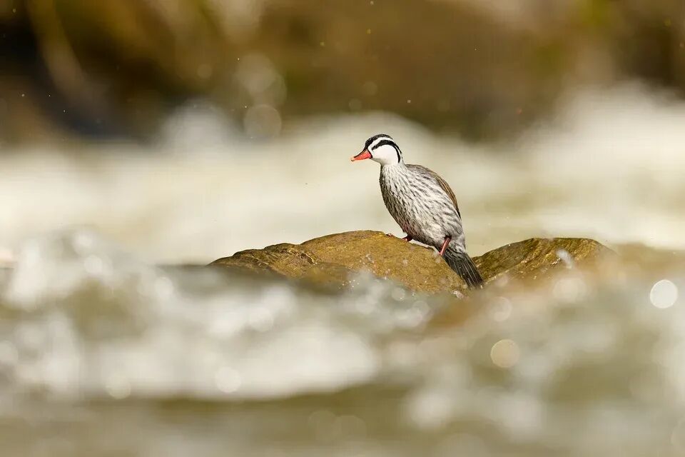 雄性湍鸭(Merganetta armata)拥有黑白相间的羽毛,色彩简洁却极为美丽。尼康Z 9 + VR 500mm f/4E @ 500mm, ISO 280, 1/1600, f/5.0