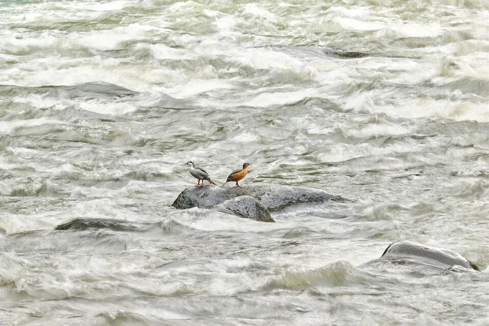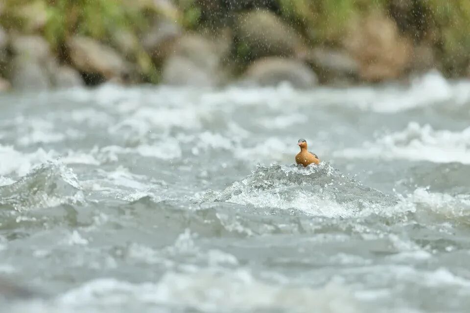 一年前,另一只雄性湍鸭对我的容忍度就高得多。可惜,我只和它相处了几个小时——时间实在太短。因此,我梦想中为这个独特物种拍下的照片,至今仍未实现。那会是一张什么样的照片呢?当我闭上眼,我看到的是这样一幅画面:湍急的河流中央,一整家子鸭子挤在一块小小的岩石上,逆光中,飞溅的水花在它们周围炸开,化作成千上万颗闪耀的水珠。