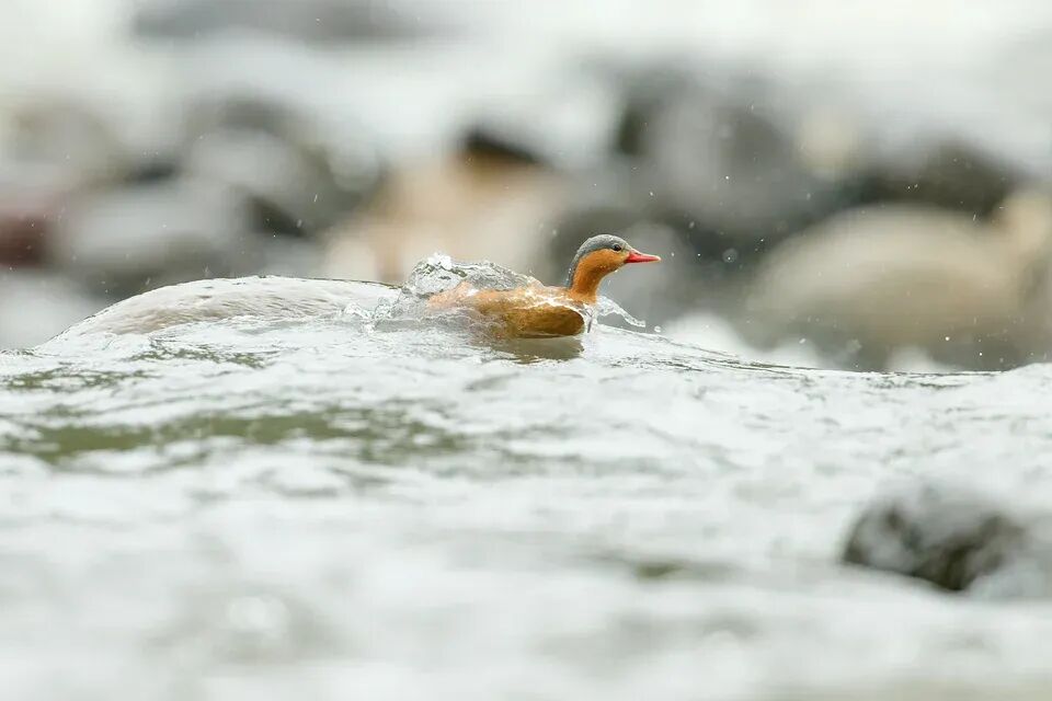 河中央的岩石是鸭子们理想的歇脚点,它们可以在上面稍作休息,然后再一头扎进湍急的水流,去河底搜寻昆虫幼虫。尼康Z 9 + VR 500mm f/4E @ 700mm, ISO 800, 1/3200, f/5.6