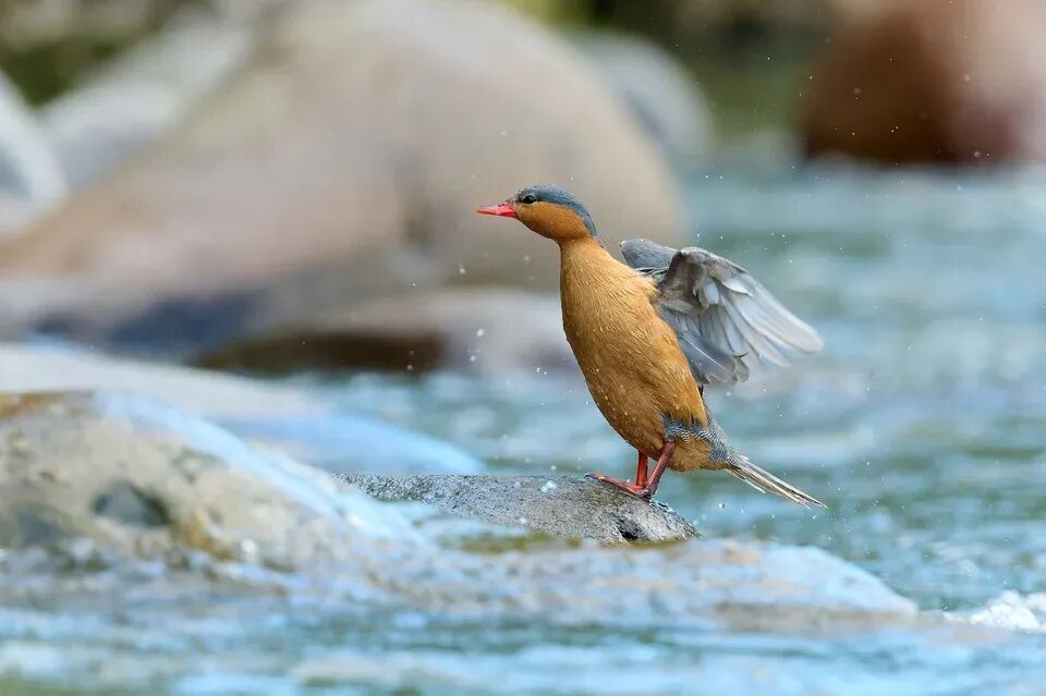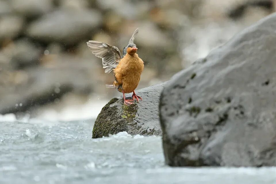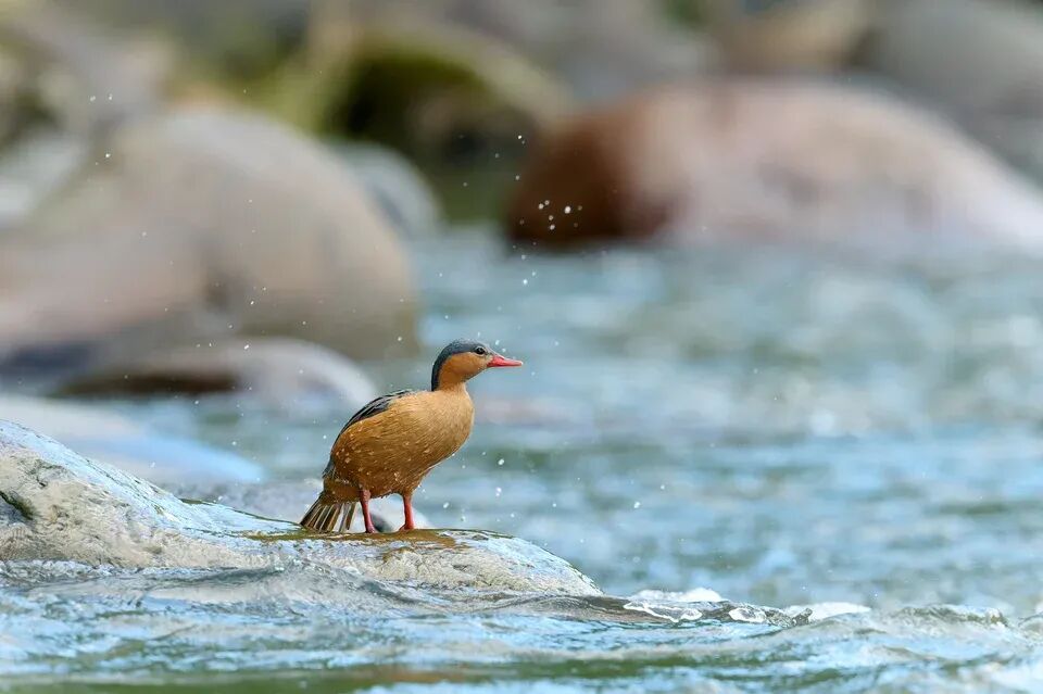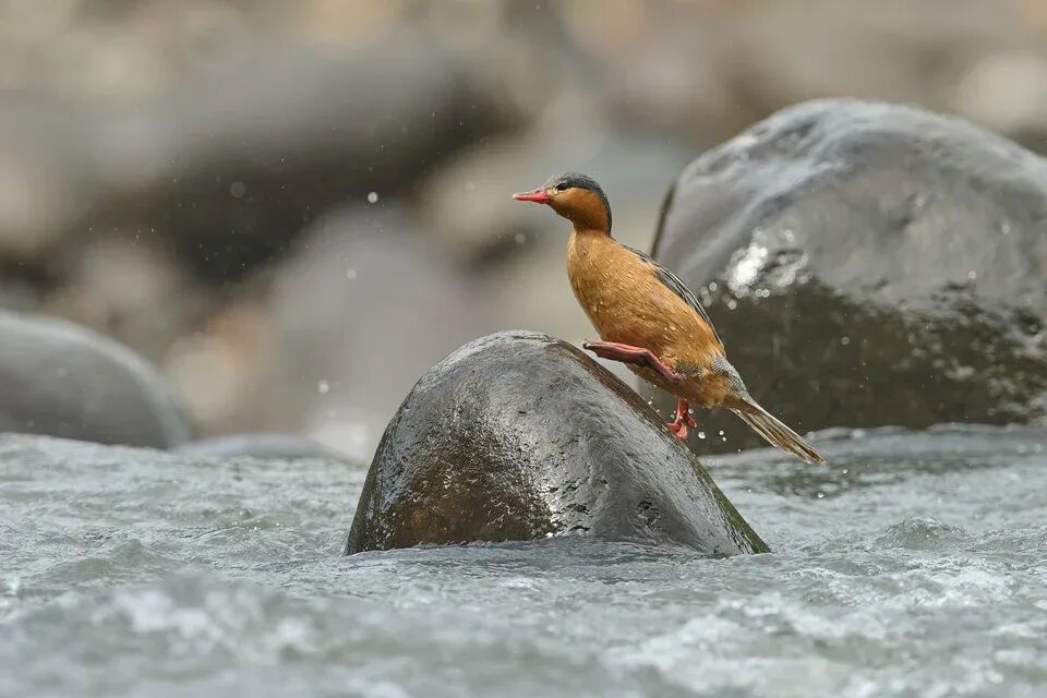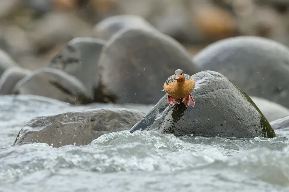 湍鸭在河中的岩石上移动时异常灵活。它们强健的腿部长有锋利的爪子,帮助它们在湿滑的表面上牢牢抓稳。尼康Z 9 + VR 500mm f/4E @ 500mm, ISO 320, 1/1600, f/5.0