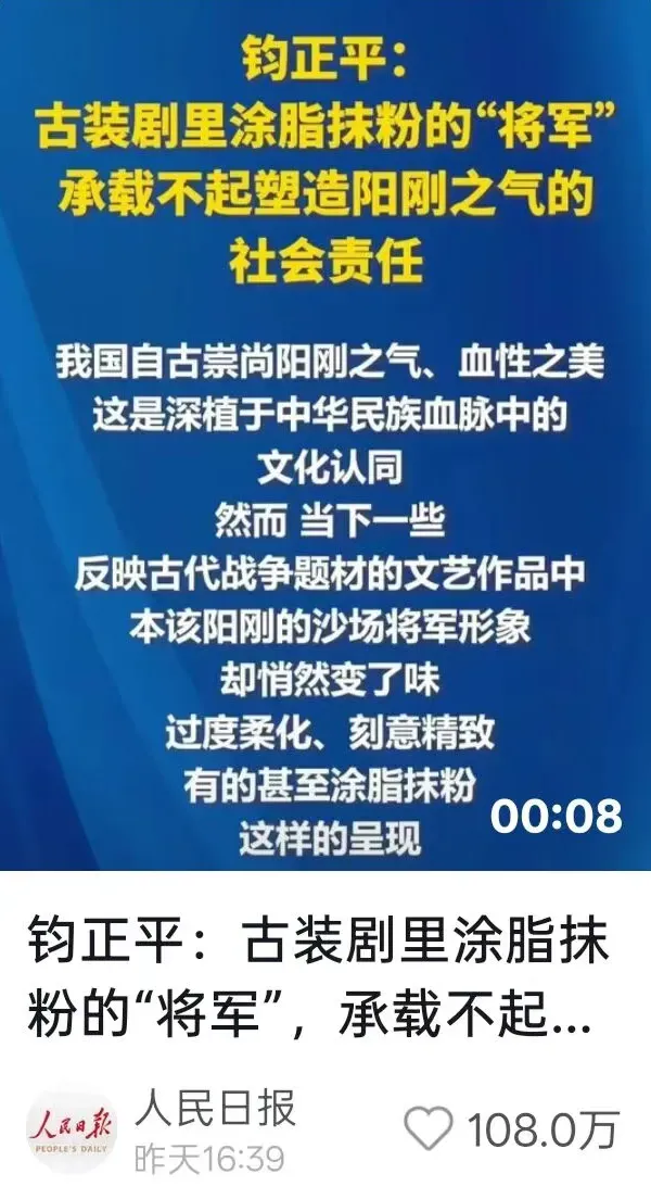 到这几天军媒和《人民日报》同时发声评:古装剧里涂脂抹粉的“将军”承载不起塑造阳刚之气的社会责任。我平时不怎么看这类剧,零星在网上看过些许片段,好奇就去研究了一下,发现这个剧真的挺离谱,从男主角武安侯的装造到女主角的言行,感觉被深深恶心到了。在《逐玉》这部剧中,张凌赫饰演的武将谢征,身披玄甲、头戴雉鸡翎,本该是叱咤沙场的铁血男儿,妆容却白皙精致,给人感觉“将军不是来打仗的,而是来谈恋爱的”。有人说,不就是一部古偶剧,只是满足小年轻对唯美氛围和绝美爱情的向往而已,用得着上纲上线吗?如果她只是讲情情爱爱没问题,这种爱情剧多它一个不多,但它错就错在非要往将军、边关、战乱、权谋、历史人物上靠。这相当于在拿着我们五千年的历史当背景板,用最轻佻的方式去消乏解闷。将军不再是血与火里杀出来的人,而成了精致妆造下的“恋爱工具”;边关不再是生死一线的战场,而只是推动情节的舞台布景。精致、无瑕疵、中性化的男主成了收割女性粉丝的钱包和打赏工具。为了迎合这种“颜值即正义”的畸形审美,将军可以没有杀气,但必须皮肤好;男人可以没有阳刚气,但必须会化妆。这些剧的问题不是“拍得美不美”,而在于不该这么拍。《逐玉》的服装道具和剧情硬伤其实是小问题,真正让人感到难受的是它突破了我们民族的情感底线。从秦始皇统一中国到如今,匈奴、鲜卑、突厥等北方民族直接或间接屠杀华夏儿女在1.2亿到1.8亿之间。最危险的五胡乱华时期,北方人口锐减超七成,近乎灭族。胡族军队破城后,不分老幼,不分军民,集体屠杀,常以堆积人头,炫耀武功。女性是五胡乱华中最悲惨的群体,遭遇了系统性暴力、长期奴役,甚至被当做军粮食用。明朝到近代以来,倭寇屡次犯华,造成中国数千万人死亡。千年来,我们的边关将士为了抵御外族侵略,抛头颅,洒热血。十几万人的军队带出去,回来的可能只有几万人,甚至全军覆没。妻子根本不知道丈夫是否活着,母亲连孩子的尸体都找不到。汉匈百年战争死伤上千万人,宋金战争牺牲逾两千万人,明清两百年战争死伤亦逾千万,崖山一役,十万军民集体投海殉国。土木堡之变,明军20万人被屠杀,如此惨烈而伟大的历史,应该值得我们后人反复纪念和缅怀。但逐玉剧组却把它改成了恋爱将军。男主谢征是头插羽毛、皮肤细腻、妆容精致的粉底将军,女主樊长玉大战在即却迷晕主帅,自己拎着杀猪刀轻而易举地斩杀了敌军主将。如果一个女子就能轻易做到,那我们历史上为了抗击外敌牺牲的上亿军民算什么?这种电视剧不讲历史、不讲家国、不讲血性、不讲责任、不讲苦难,把原本残酷的历史和惨烈的战场娱乐化、恋爱化、价值观肤浅化,只图流量赚钱和颜值正义,甚至为了推进男女主角恋爱进展,不惜篡改历史,违背军事常识。久而久之,真正的厚重会被遗忘,真正的苦难会被稀释。网友归纳了近年来古偶剧中的部分“将军”形象 图片来自网络更可怕的是,很多青少年也会看,他们的价值观和历史观正在形成中,这种电视剧会不会误导他们对古代战争史的认知?不要认为架空就可以胡编乱造,顶着武安侯的名号,穿着古代将士的铠甲,敌军照着北方游牧民族形象,塑造一群黄种人在边疆厮杀,这根本不是架空,而是赤裸裸的历史投射。我们可以接受填充,接受虚构,但绝不能接受用历史苦难当噱头,用边关将士做垫脚石,用民族伤痛换流量。一个不尊重先烈、不敬畏历史的作品,再华丽的服化道也掩盖不住空洞的灵魂。再好的收视率,也是对民族历史和华夏儿女情感的伤害。评论区说说,你认为现在的娱乐圈,是不是到了该整治“粉底液将军”的时候了?