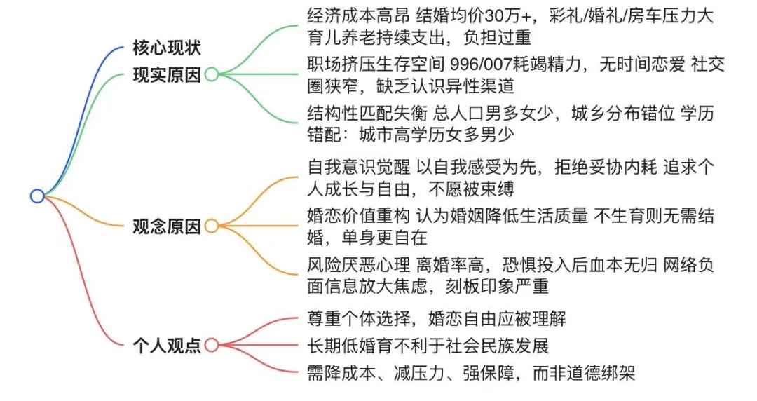 #年轻人为什么不想结婚了 #单身群体越来越多 #婚恋成本太高 #性别比例失衡 #离婚率走高 #当代年轻人婚恋观 #工作压力大社交圈窄 #互联网影响婚恋认知