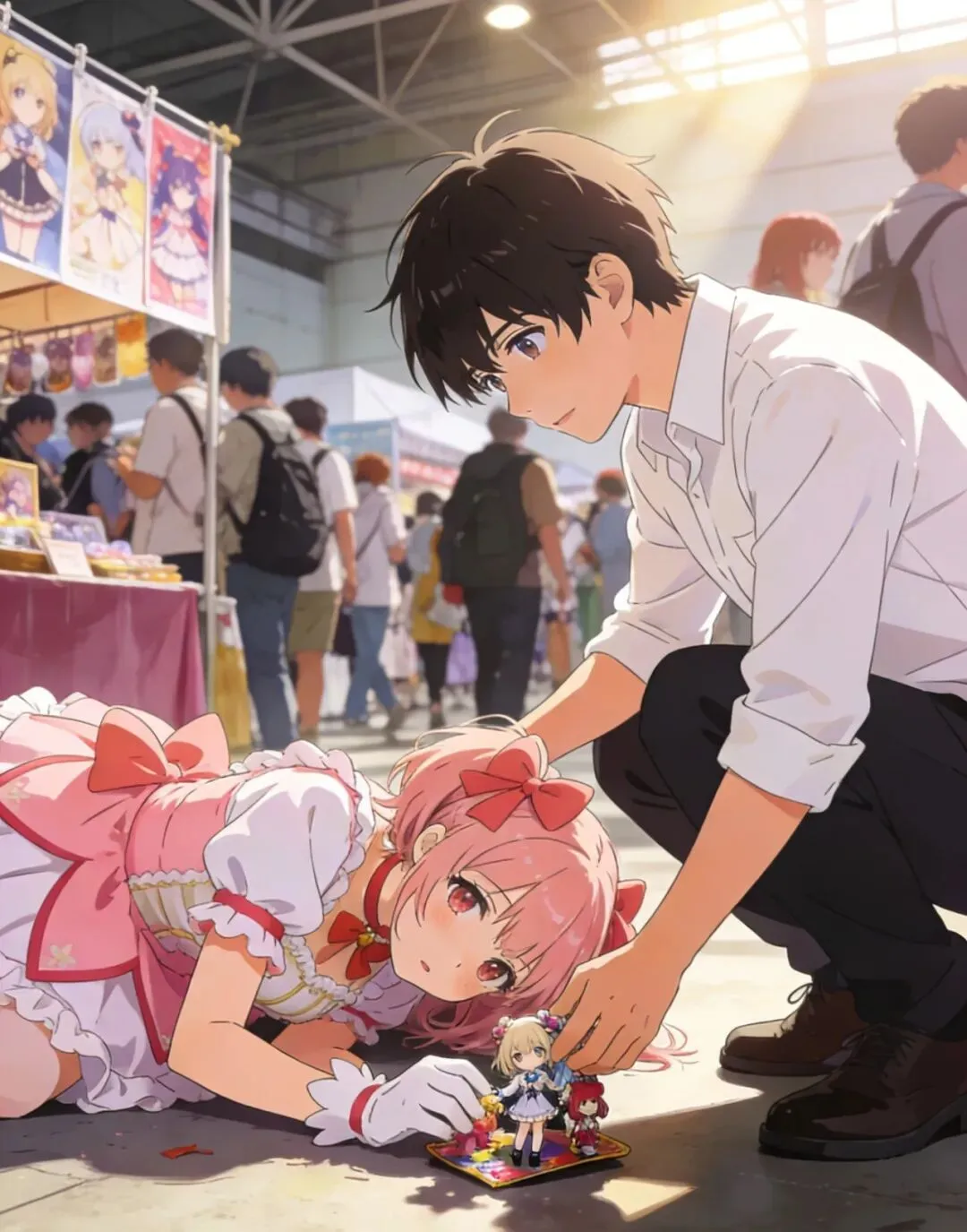 没想到,这一天真的来了。上个月,本市举办了一场大型漫展,我提前好几个月就开始准备,定制了最喜欢的动漫角色的 cos 服,还精心做了造型。漫展当天,现场人山人海,到处都是穿着各式各样 cos 服的同好,热闹非凡。我兴奋地穿梭在各个展位之间,和同好们合影留念,还入手了几款心仪已久的手办。就在我抱着手办,满心欢喜地准备去下一个展位时,不小心被拥挤的人群推了一下,脚下一个趔趄,重重地摔在了地上,怀里的手办也散落一地。周围瞬间投来不少目光,我尴尬得脸颊发烫,恨不得找个地缝钻进去,只能手忙脚乱地去捡手办。就在这时,一个穿着干净白衬衫的男生走了过来,他蹲下身,帮我捡起散落在地上的手办,动作轻柔,生怕把它们弄坏。捡完手办后,他站起身,温柔地问我:“你没事吧,有没有哪里摔伤了?” 他的声音很好听,像动漫里的男主配音一样,低沉又富有磁性。我抬头一看,瞬间心跳加速 —— 他长得干干净净,眉眼温柔,鼻梁高挺,嘴角带着淡淡的笑意,就像从动漫里走出来的少年一样。我愣了好一会儿,才结结巴巴地回答:“没... 没事,谢谢你。” 他笑着把整理好的手办递给我,说道:“小心点,人挺多的。” 说完,他就转身离开了,只留下我拿着手办,站在原地久久回不过神。