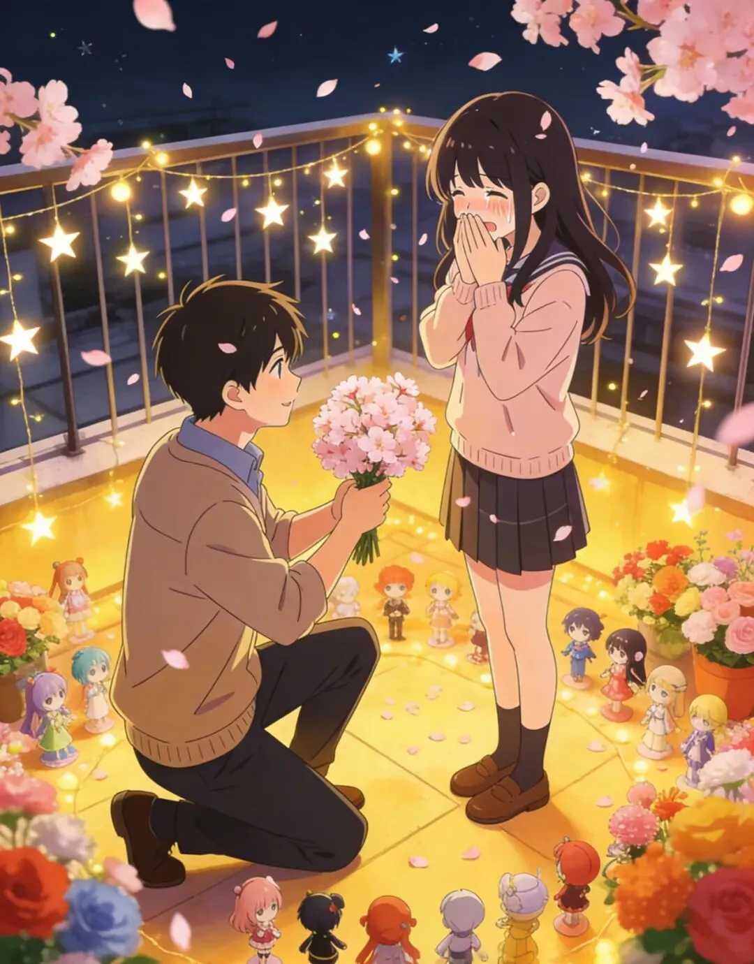 上周是我的生日,我以为他会像往常一样,给我买动漫周边作为礼物。生日当天,他约我出门,带我来到了一个我意想不到的地方 —— 我们最喜欢的恋爱番里,男主告白的那个天台。天台上挂满了星星灯,摆满了我喜欢的动漫手办和鲜花,微风轻轻吹过,带着淡淡的花香。他拿着一束樱花,缓缓走到我面前,眼神温柔又认真,他对我说:“我知道你喜欢动漫,喜欢二次元的浪漫,我想把动漫里的浪漫,带到现实里,给你一场三次元的动漫恋爱,你愿意做我的女主吗?” 我当时就哭了,不是难过,是开心,是感动,原来我梦寐以求的动漫恋爱,真的出现在了现实里。我用力地点点头,哽咽着说:“我愿意。” 他笑着把樱花递给我,然后紧紧地抱住了我,那一刻,我觉得自己是世界上最幸福的人。