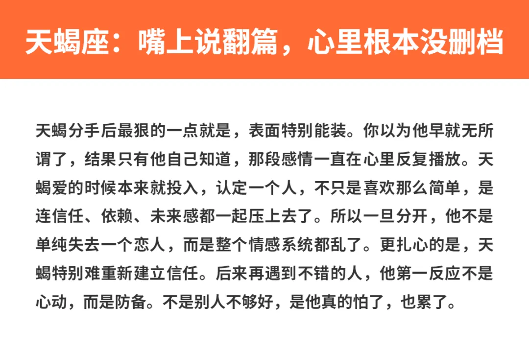 有些人分手,哭一场、喝两杯,过段时间也就翻篇了,甚至还能很快开始下一段感情。但也有些星座不是这样,他们一旦认真爱过,分开之后就像心里那扇门直接焊死,别人想进来都难。不是他们没人追,也不是条件差,恰恰相反,越是看着冷静、正常,越说明他们把情绪都压在心里了。表面上像没事人,照常上班、吃饭、发朋友圈,实际上对旧感情根本没真正放下。今天就来聊聊,分开后最难重新恋爱的三个星座,说白了,他们不是不想爱,是很难再信了。