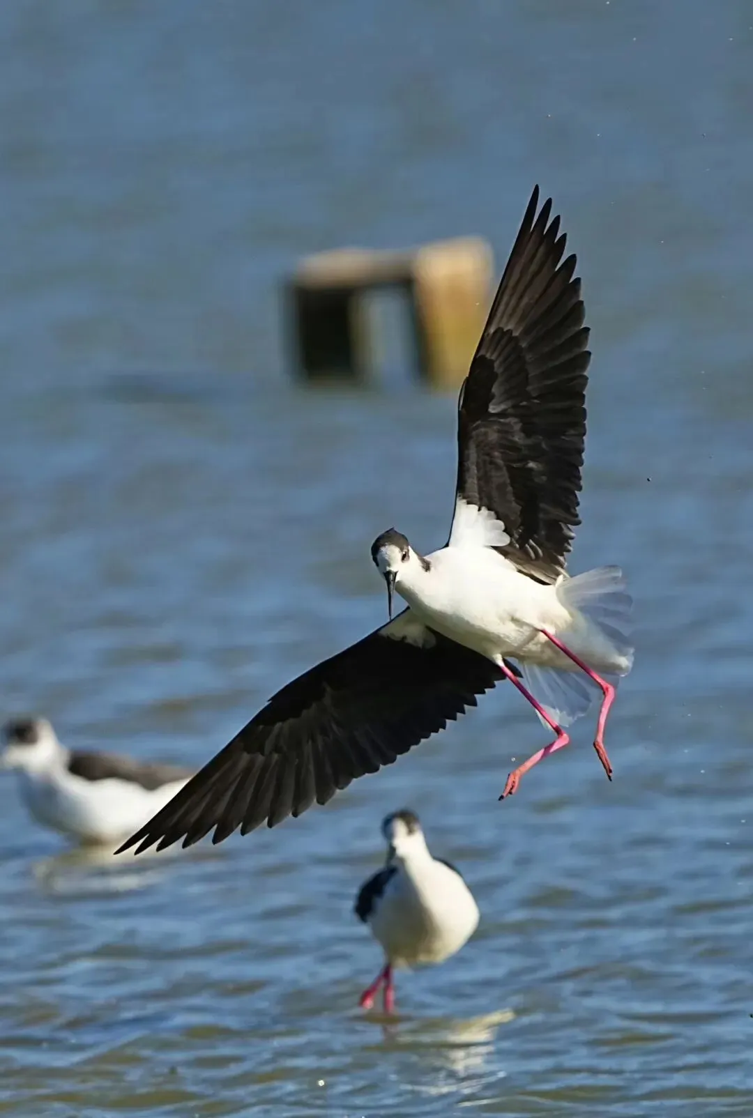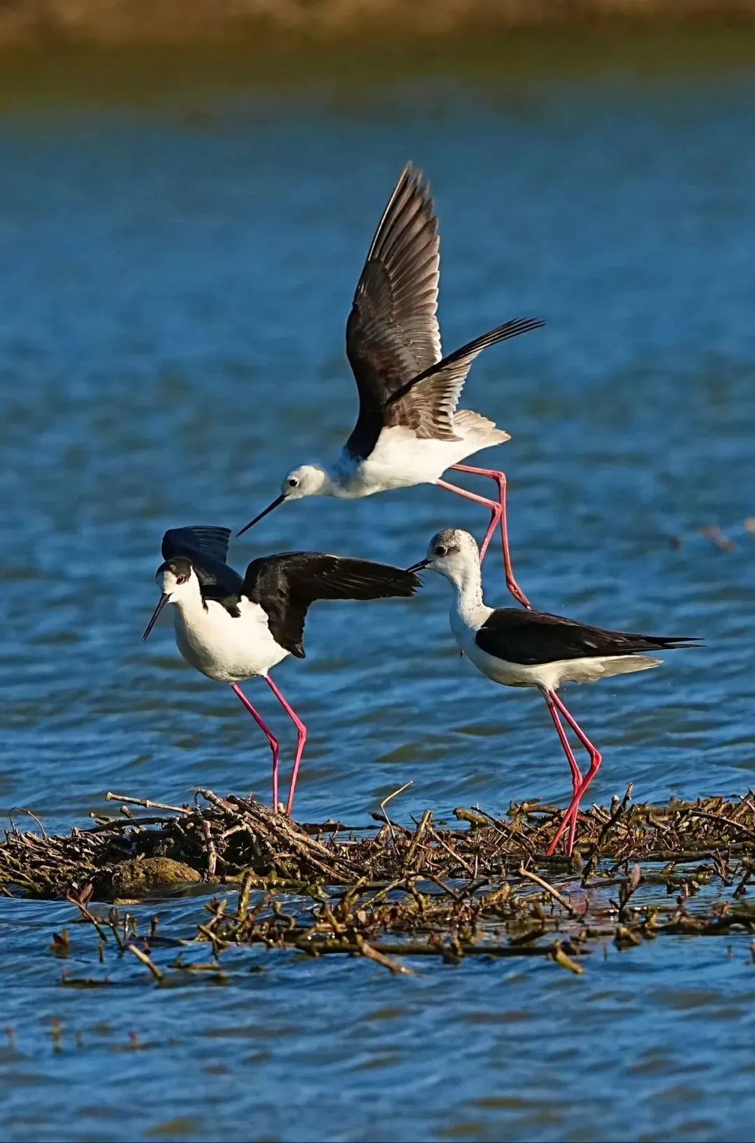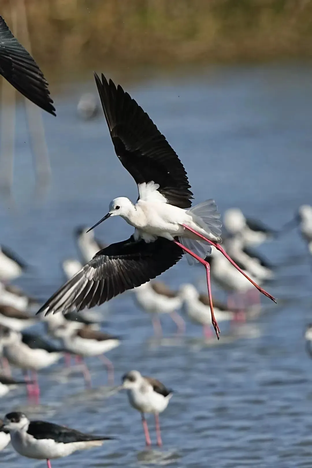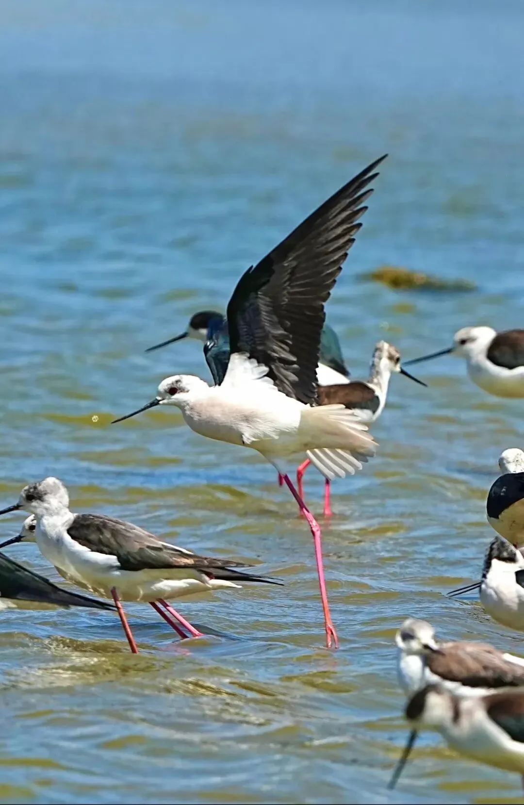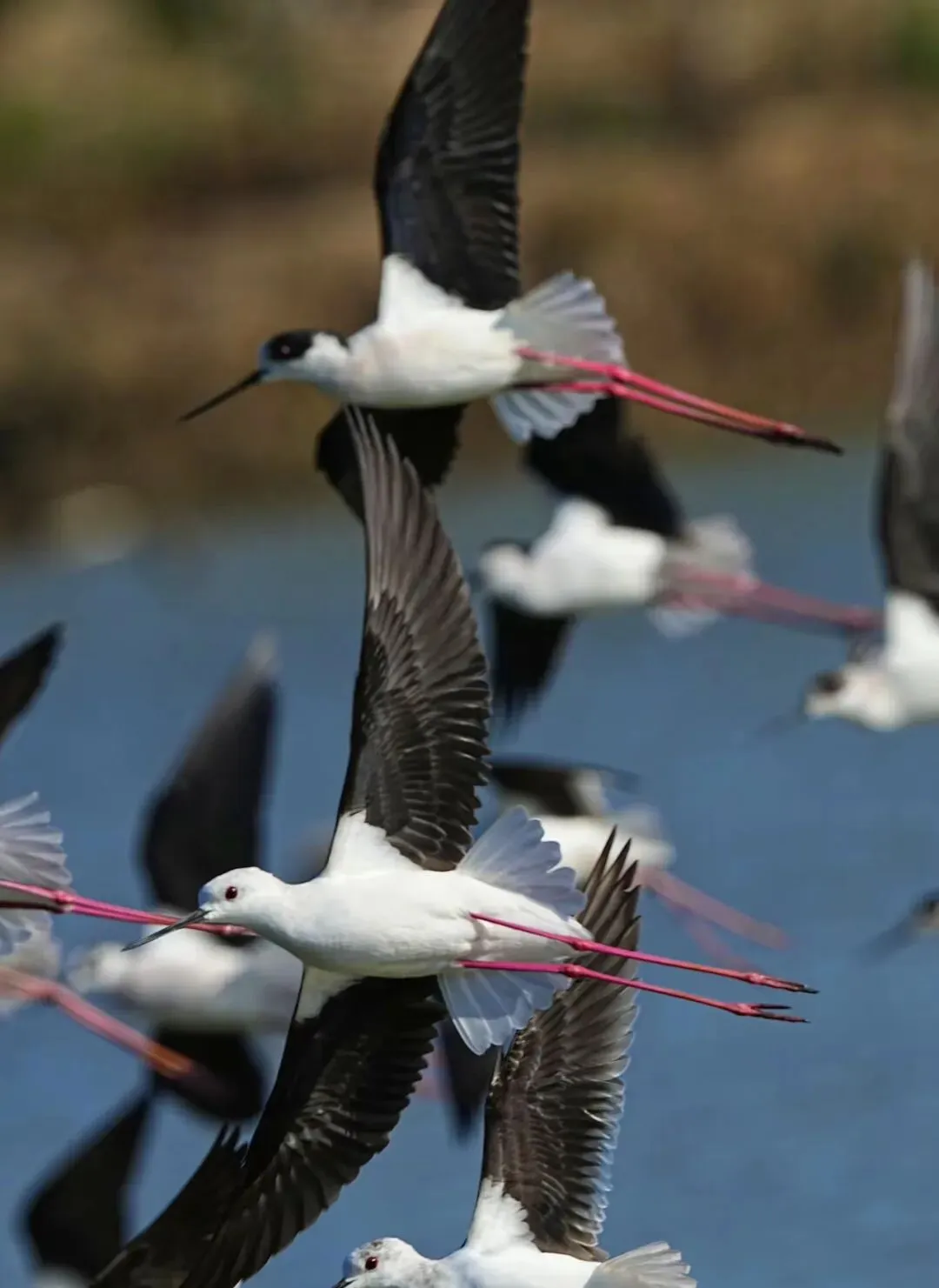 鸟届超模大长腿是黑翅长脚鹬的别号,这长长的,性感的,粉红色的长腿,黑色的翅羽,白色的腹部,黑白红三色搭配🉐️恰到好处,看着也很养眼。 这里鱼虾丰富,充足的食物,这群长脚鹬没有食物的忧虑,天天好吃好喝着,享受😎着着春天的暖阳🌞,日子过得悠闲舒适。 走秀是每天必须上演的节目,充满了仪式感,长腿林立,靓羽霓裳,让站在鱼塘边上的几只大苍鹭看花了眼。 春光明媚,春风拂面,长脚鹬倚仗鸟多势众,霸占了本属于白骨🦴顶鸡的鱼塘,白骨顶只能猥琐的蹲在犄角旮旯里小心地躲着仙女般存在的长脚鹬。 群体走秀的大场面颇为壮观,黑翅翻飞,红腿闪耀。靓瞎了白骨顶鸡的眼睛,一头扎进泥水里,不敢观看!