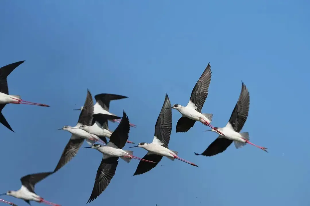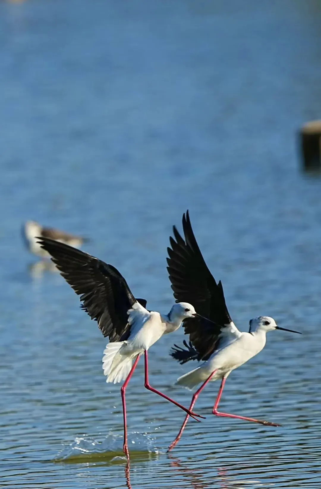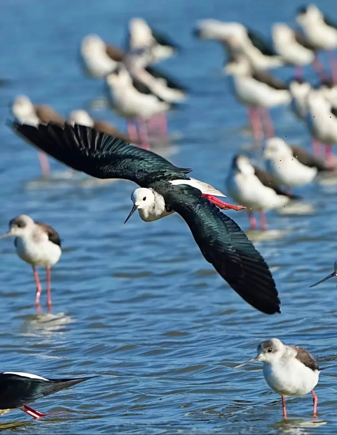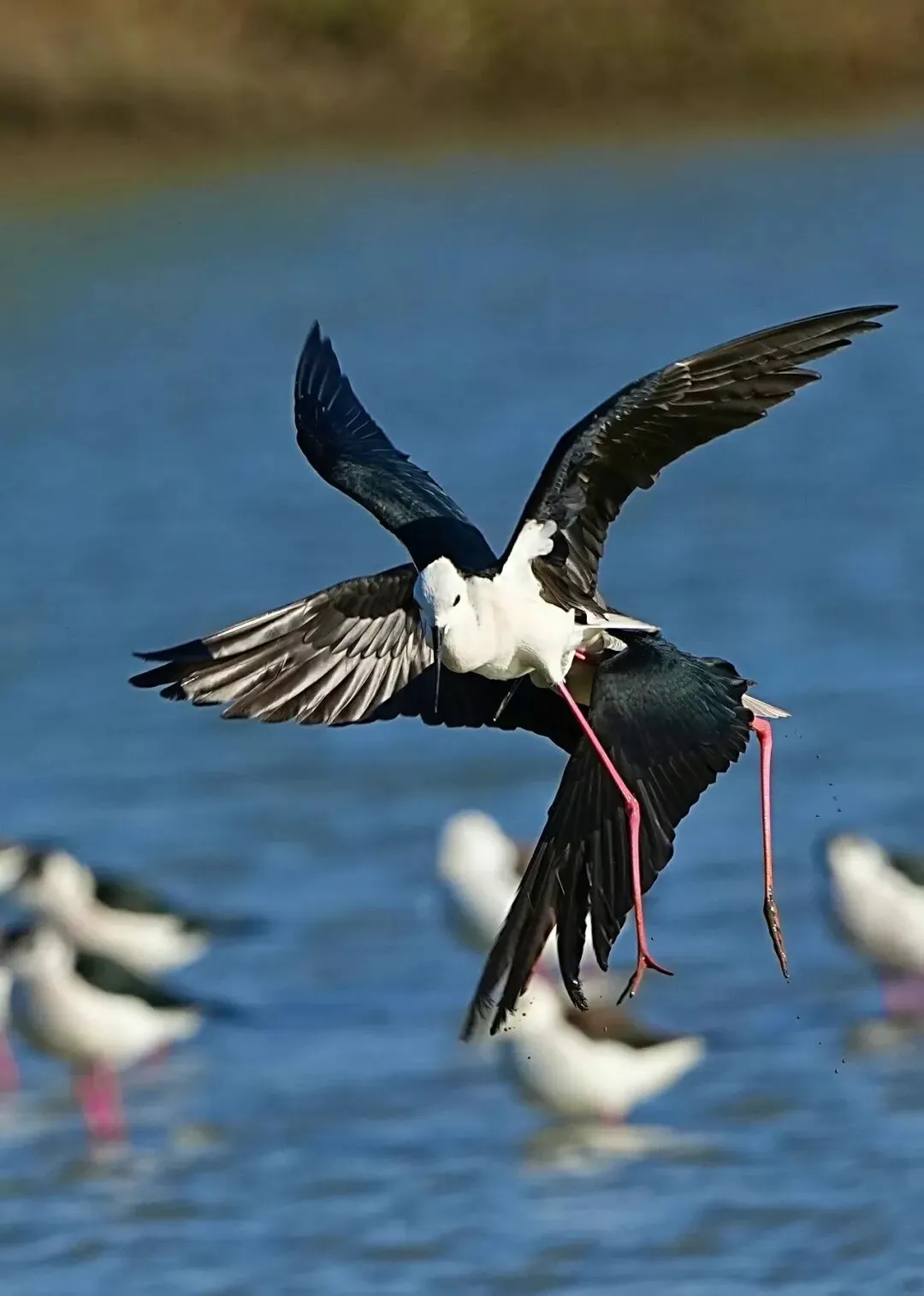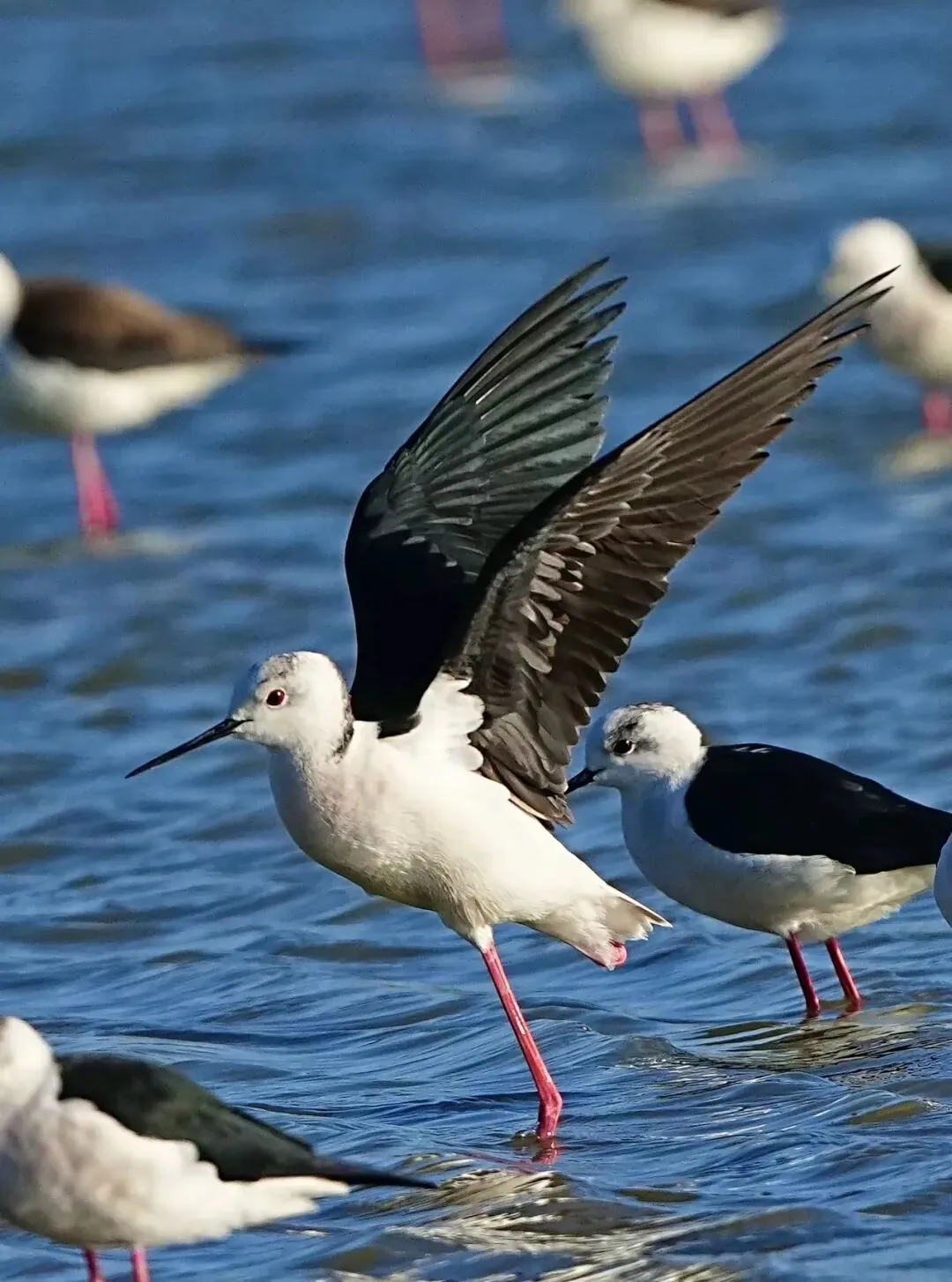 鸟届超模大长腿是黑翅长脚鹬的别号,这长长的,性感的,粉红色的长腿,黑色的翅羽,白色的腹部,黑白红三色搭配🉐️恰到好处,看着也很养眼。 这里鱼虾丰富,充足的食物,这群长脚鹬没有食物的忧虑,天天好吃好喝着,享受😎着着春天的暖阳🌞,日子过得悠闲舒适。 走秀是每天必须上演的节目,充满了仪式感,长腿林立,靓羽霓裳,让站在鱼塘边上的几只大苍鹭看花了眼。 春光明媚,春风拂面,长脚鹬倚仗鸟多势众,霸占了本属于白骨🦴顶鸡的鱼塘,白骨顶只能猥琐的蹲在犄角旮旯里小心地躲着仙女般存在的长脚鹬。 群体走秀的大场面颇为壮观,黑翅翻飞,红腿闪耀。靓瞎了白骨顶鸡的眼睛,一头扎进泥水里,不敢观看!