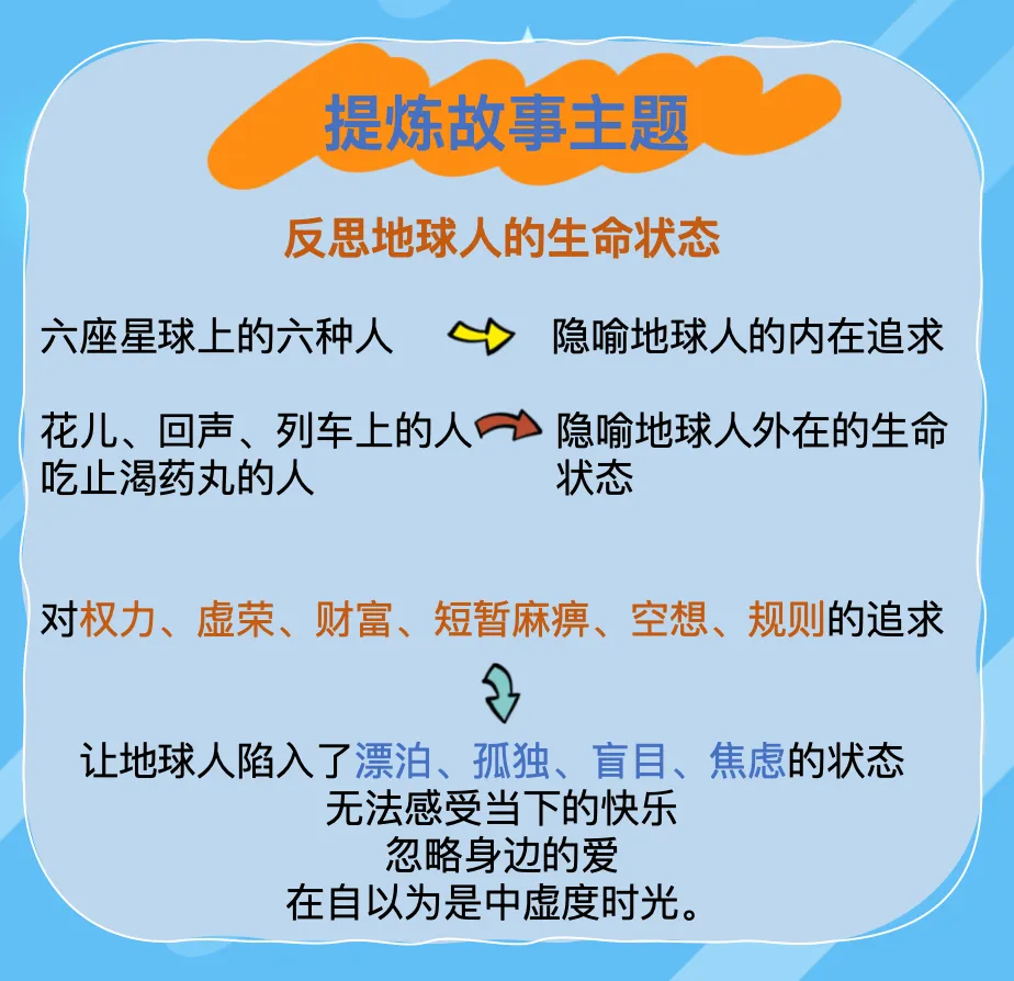 第一层是批判成人世界的功利、庸俗与盲目;第二层是阐述"爱" 的本质;第三层是探讨幸福的真谛,即在复杂世界中保持对纯粹与美好的追求。让孩子理解,经典之所以能流传,在于它能回应不同时代的人生命题。