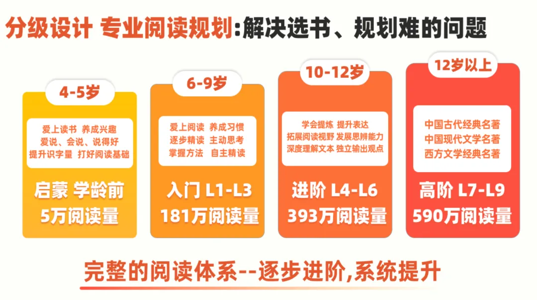 从幼儿园阶段的50本经典绘本,到小学阶段的55本名著,我会逐字逐句带孩子读完每一本书,帮助没时间陪读、缺乏引导能力的家长,让孩子真正完成新课标要求的阅读量。