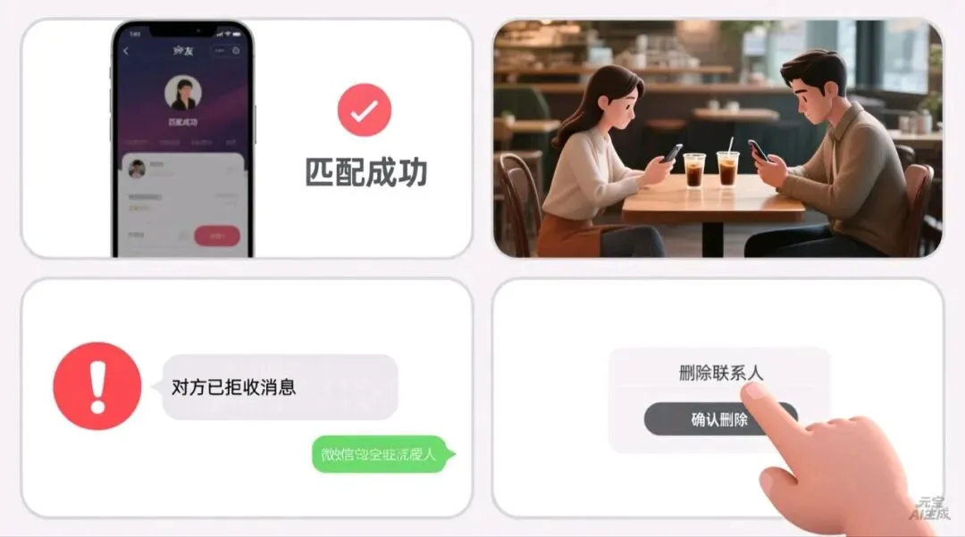 深夜十一点,你划掉最后一个匹配对象,像清空购物车般轻松。今天“已读不回”三个,“在吗”开场白两个,还有一个直接问“周末酒店你订还是我订”。手机屏幕暗下去的瞬间,你突然想起,这已经是你本月第十七次尝试“点一份爱情外卖”,却总是在送到前就取消了订单。