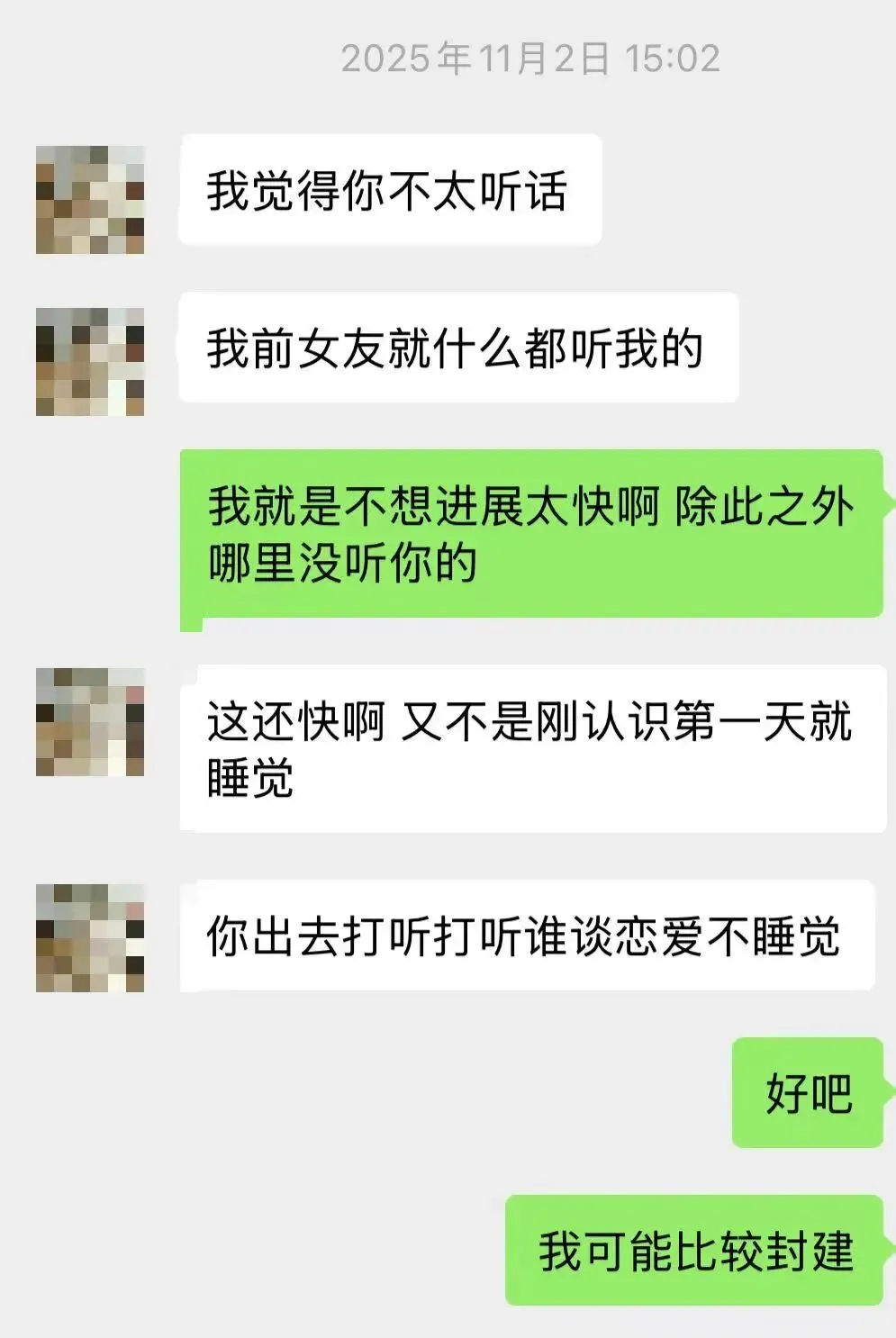 我俩的分手原因是男主再一次劝说我,让我降低底线,在我月经期间想与我发生关系,我明确拒绝,男主再一次pua我,说他前女友当时都答应了,一点事没有。