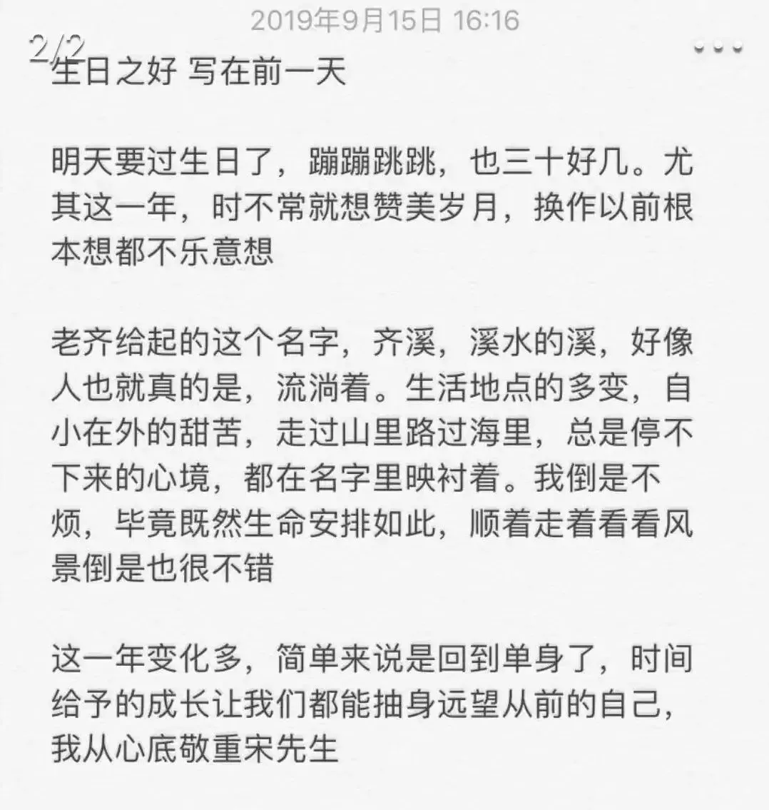 2019年,齐溪在生日前夕,以体面的方式宣布结束这段关系。