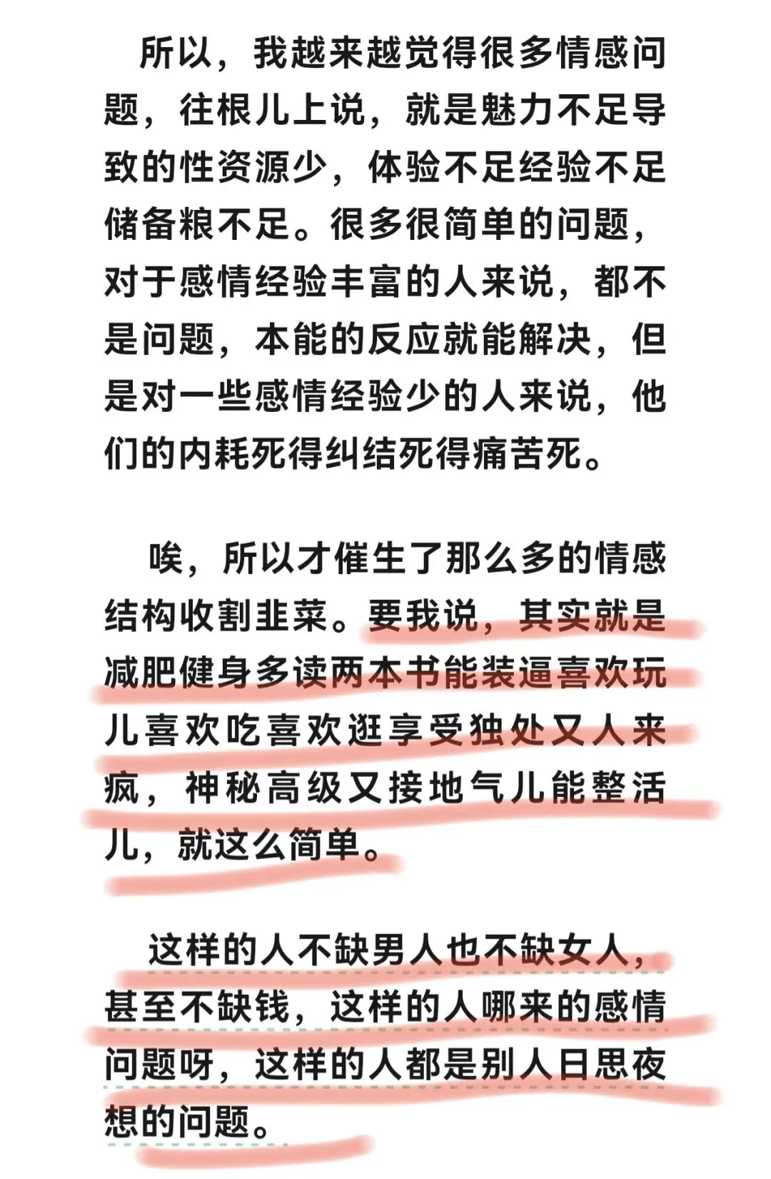 很多情感问题,往根上说,就是魅力不足导致的性资源少,体验不足经验不足储备粮不足。
