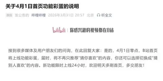 称接到很多媒体及用户朋友们的问询,在此回复大家:是的,4月1日零点,B站首页将上线功能彩蛋,届时,将不再只推荐“猜你喜欢”的内容,你还可以选择切换成“猜别人喜欢”的内容,新功能限时上线24小时。