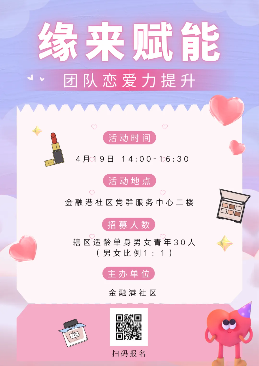 为了让您在 “缘来赋能・团队恋爱力提升” 活动中展现最美的自己,建议女生嘉宾化个美美的淡妆出席哦~请记得带上自己常用的化妆品、小镜子,我们将为您免费提供一次性唇刷、卸妆水和一次性粉扑,让您的补妆和卸妆更加方便卫生。期待与您共同度过一个美好的下午!