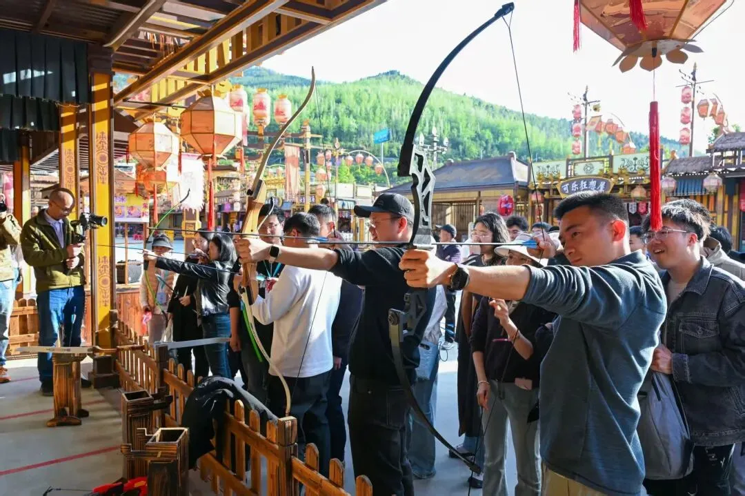 在大蜀道不夜三国城,“三国情缘·银票争霸赛”火热上演,射箭场“一‘箭’倾心”引得在场男生摩拳擦掌,套圈区“情‘投’意合”成女生秀场。射中靶心、套中奖品所获“银票”都可兑换小吃饮料,活动有趣且充满烟火气。
