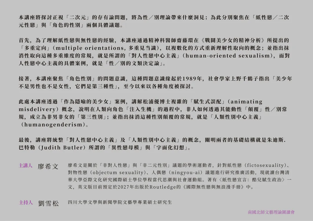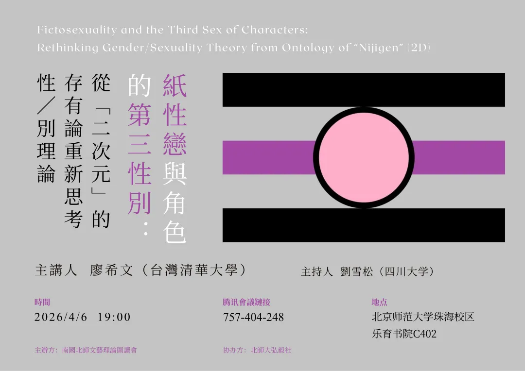 本讲座将探讨正视「二次元」的存有论问题,将为性/别理论带来什么洞见;为此分别聚焦在「纸性恋/二次元性恋」与「角色的性别」两个具体议题。