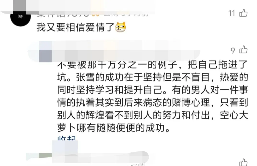 无意中我还刷到一个视频有很多漂亮的女骑手蹭张雪流量,底下就有评论提醒张雪千万不要飘,即使我依然相信爱情但人性的幽微不忍直视。希望张雪可以一辈子不辜负这份深情!