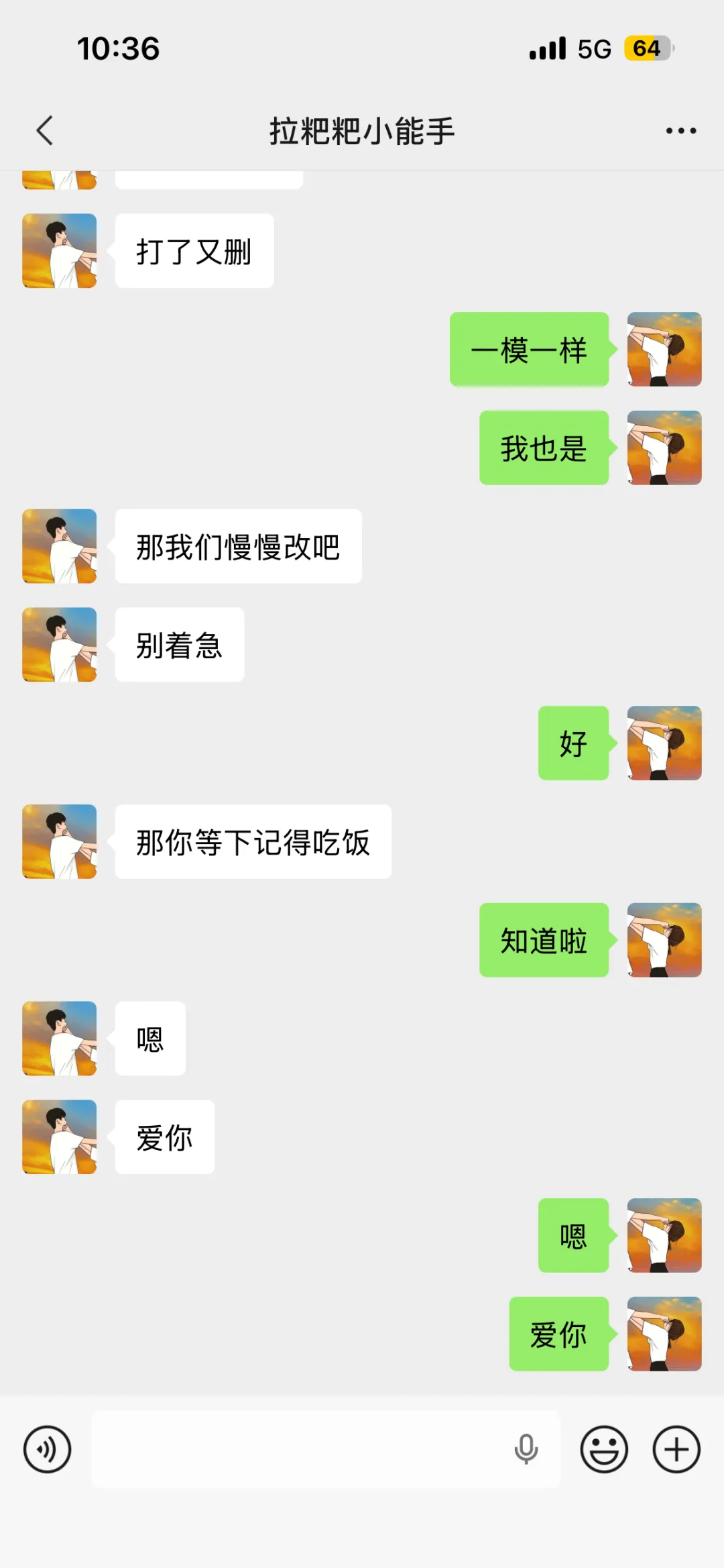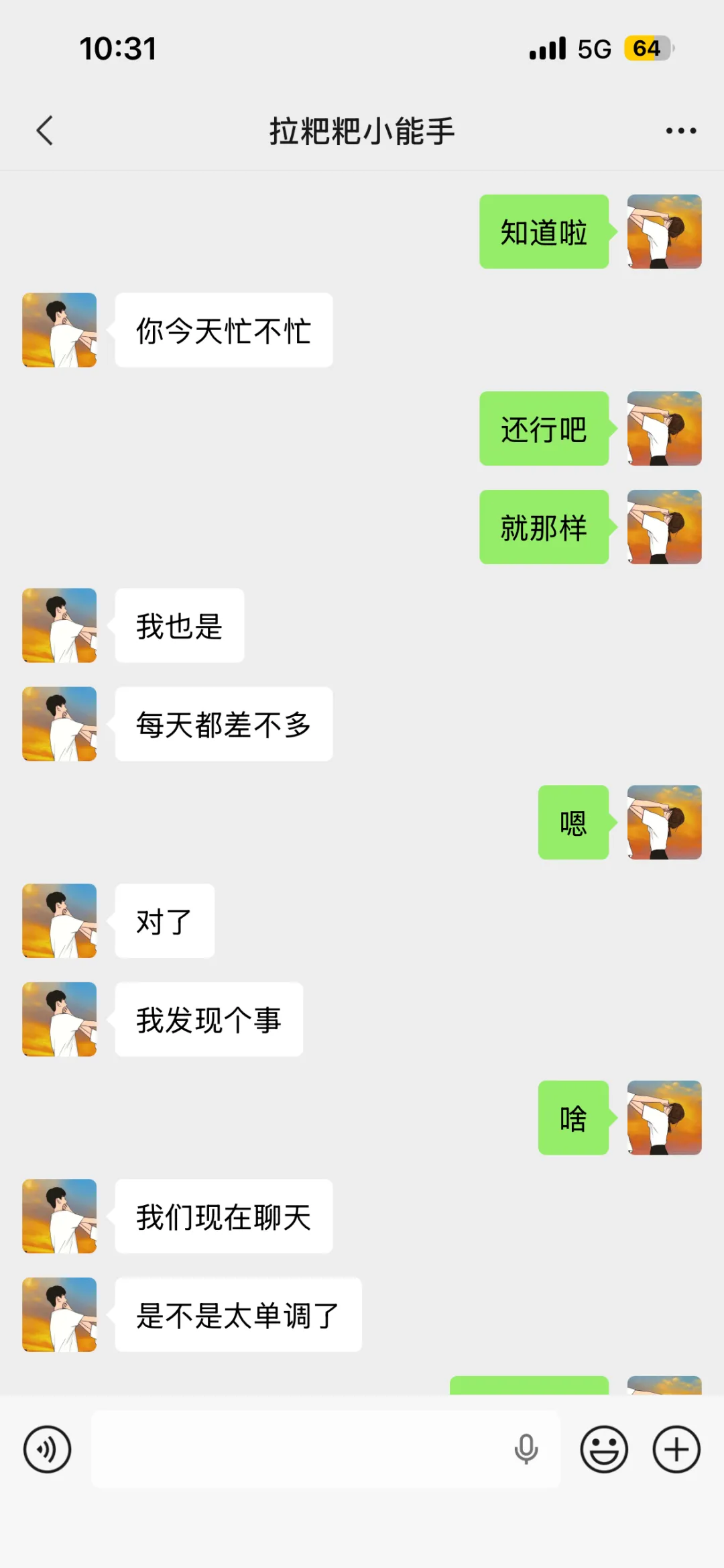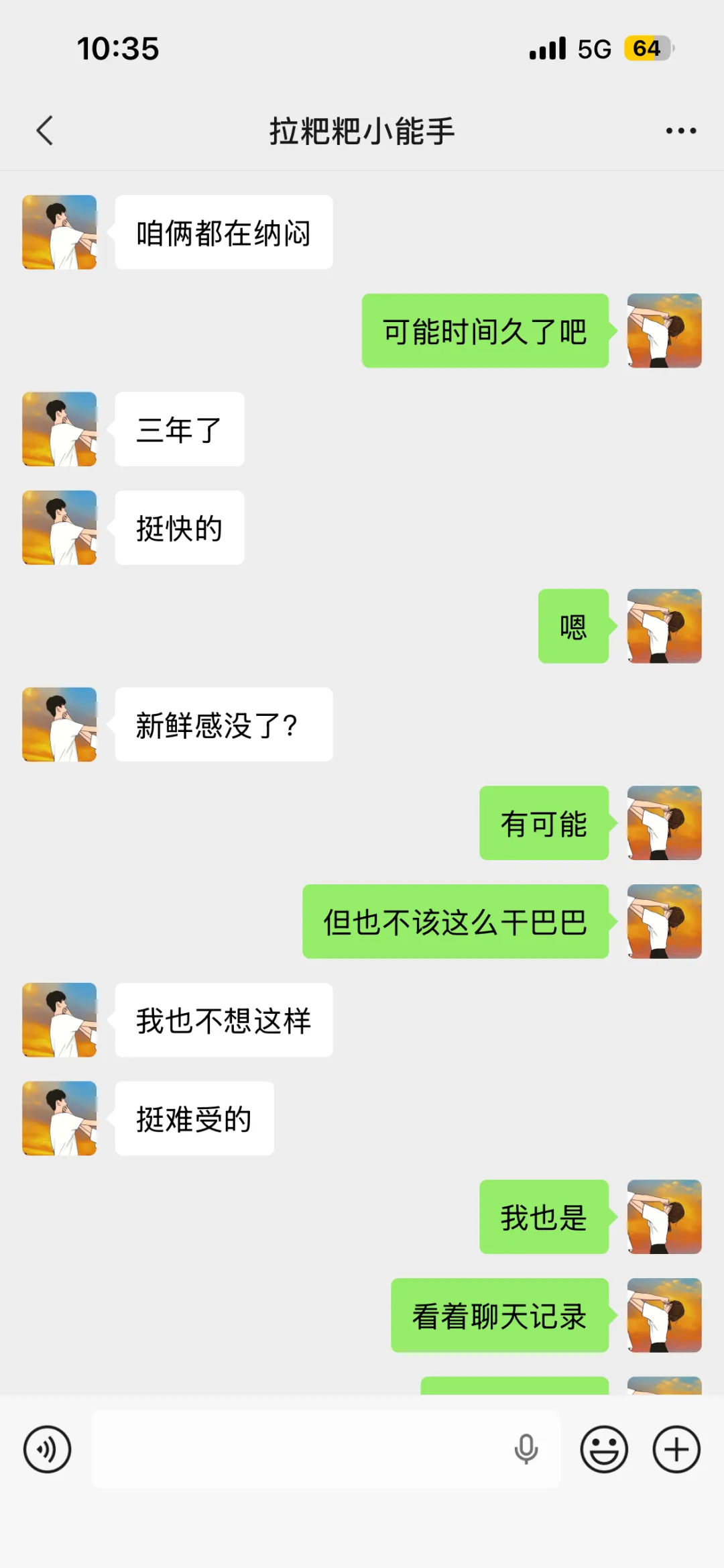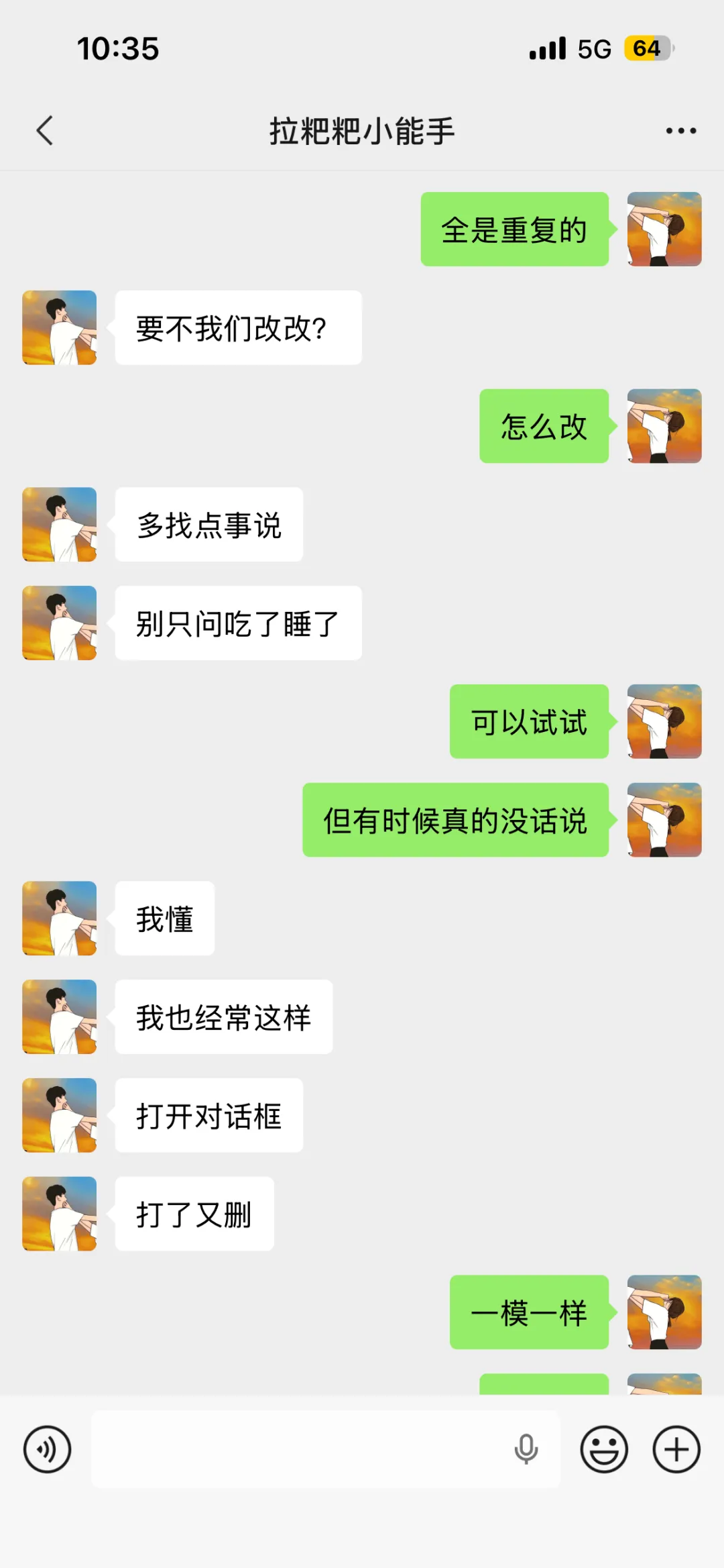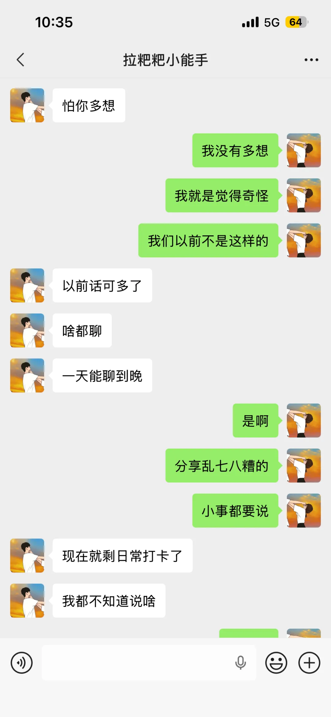 3. 我跟对象之前也这样,后来我们约定不发重复的问候语,想说话就说真实的感受,哪怕是吐槽工作、吐槽天气都比打卡强,你们既然都意识到问题,也彼此喜欢,主动一点打破僵局就好,慢慢就会回到以前的状态。