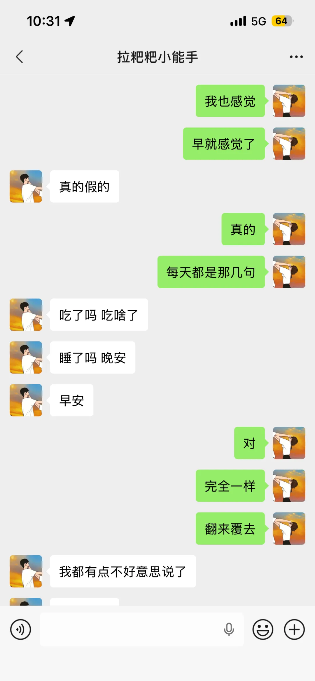 可现在不知道从什么时候开始,我们的聊天变得特别单调,每天翻来覆去就是“吃了吗”“吃啥了”“睡了吗”“早安晚安”,像完成任务一样打卡。