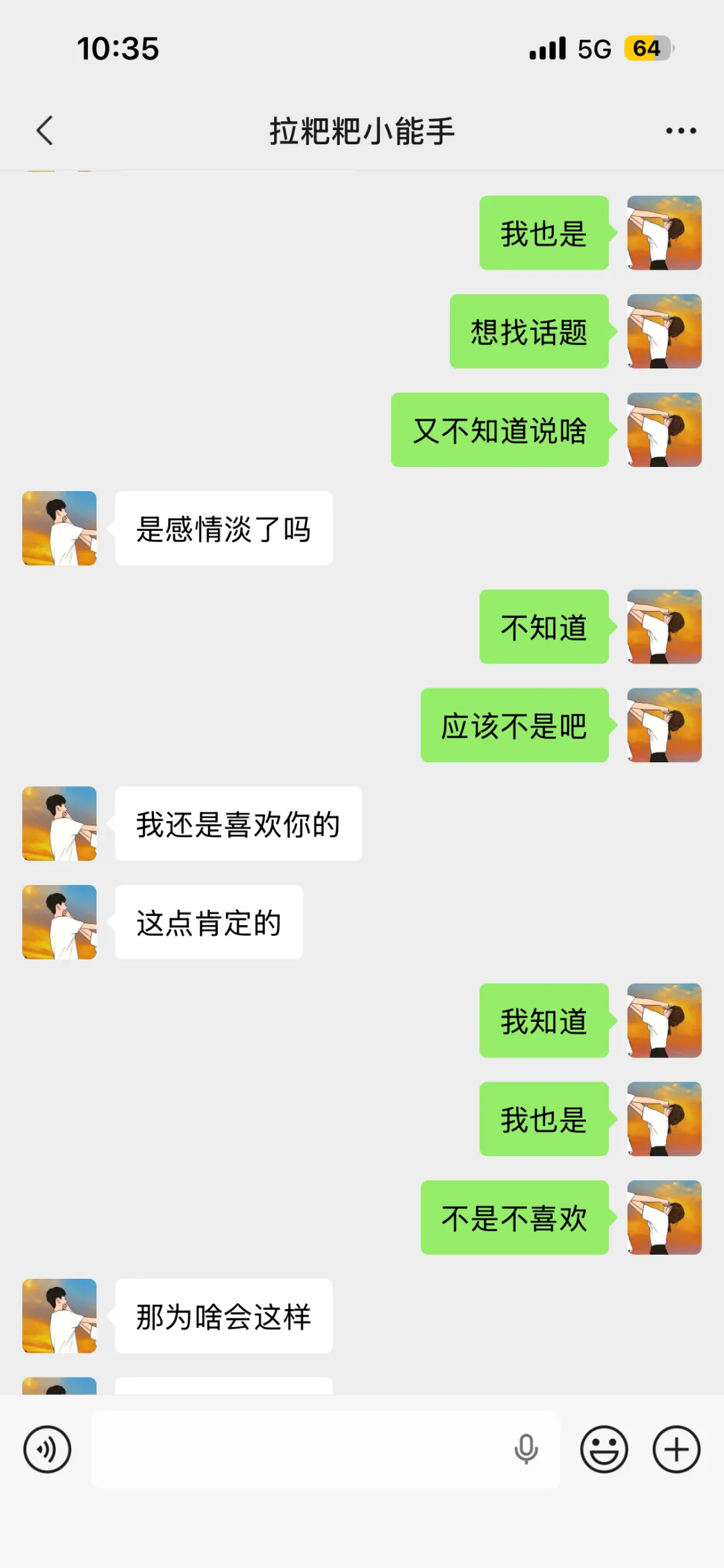我们俩也认真聊过这个问题,都觉得很困惑,心里明明还喜欢着对方,没有不爱了,也没有矛盾,可就是不知道该聊些什么,打开对话框打了又删,那种想靠近却没话说的感觉太难受了。