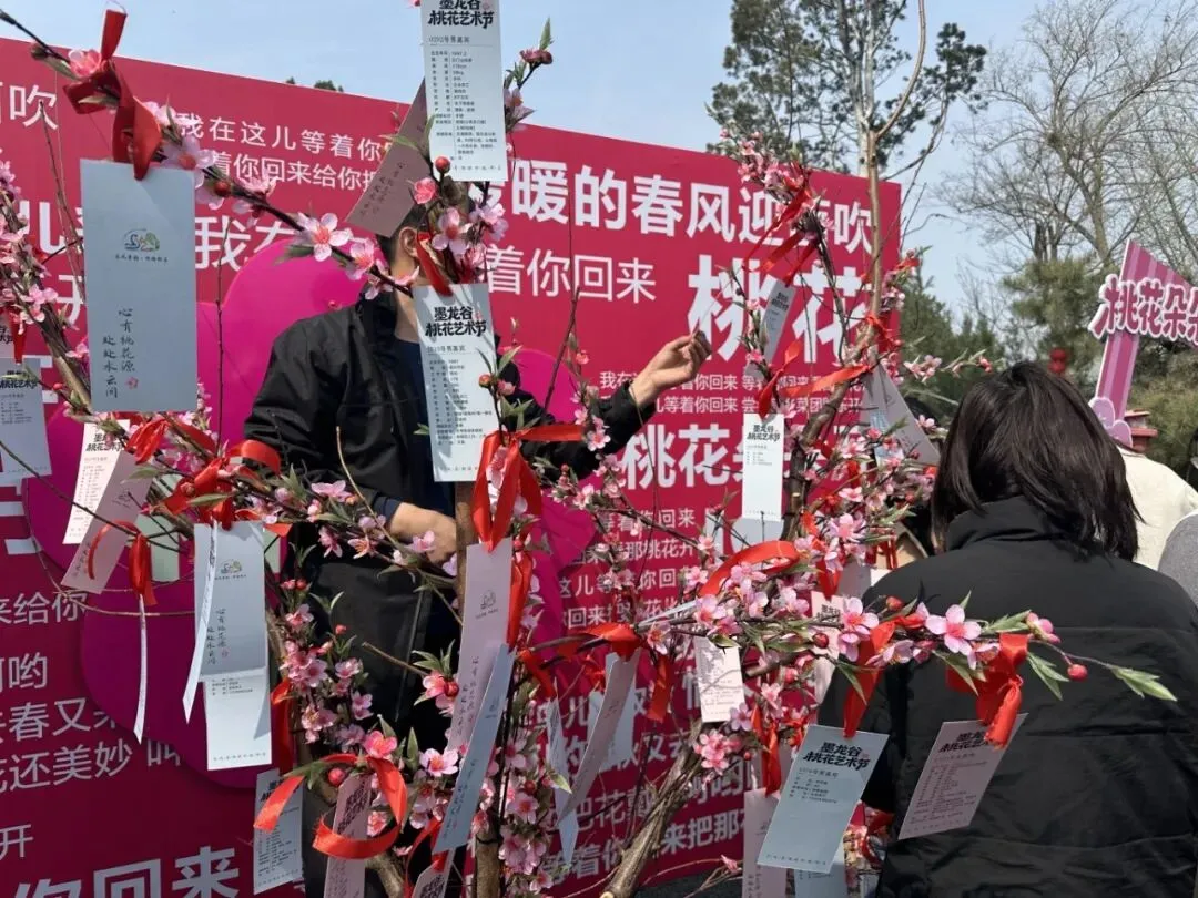 百余名青年赴盛会,千张卡笺寄初心。活动吸引了周边多家企业共146名青年职工参与,每个人的信息都被精心制成卡片,悬挂在盛放的桃花枝头。活动当天,游客们一边赏花一边翻阅卡片,遇到心仪的对象便当面交流、加深了解;现场更设趣味互动游戏,让青年们在玩乐中拉近距离、升温情愫。最终有3对嘉宾成功牵手,以桃花为媒、以春风为证,为墨龙谷的春日盛景,镌刻下最浪漫甜蜜的印记。