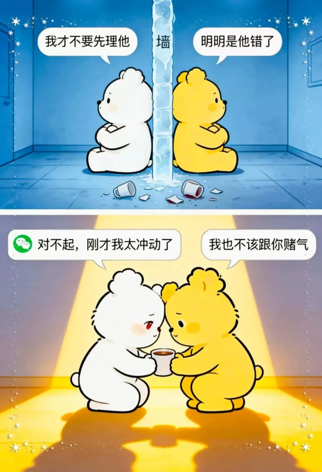 一段关系中,吵架是在正常不过的了,情绪谁都有,而区别是你会如何解决。就算再不想说话,你们也可以约定一个小时或两个小时以后我们再交流,现在都彼此静静。冷战带来的伤害是远超于吵架本身的。当然,也不要认为谁低头谁就是认输了,关系都是相互的,要想走的长远,靠的是彼此包容、相互理解。