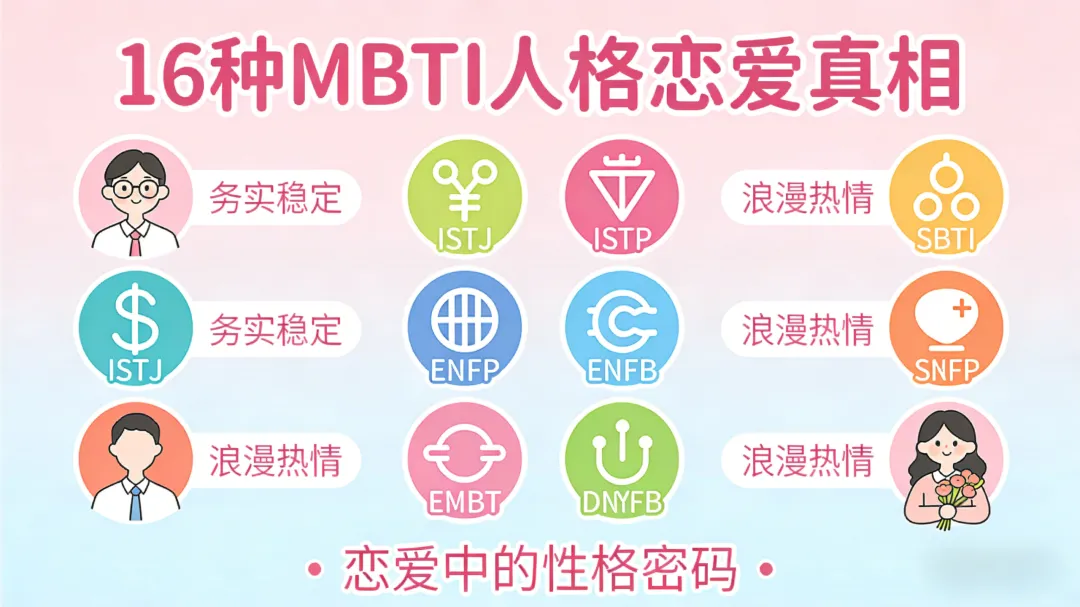MBTI早就把答案藏在了你的人格里了。它不只是用来贴标签、玩梗,更能帮我们看清自己的恋爱模式:你喜欢怎样的相处节奏、容易陷入哪些情感误区、最适配的TA是什么模样,全都一目了然。