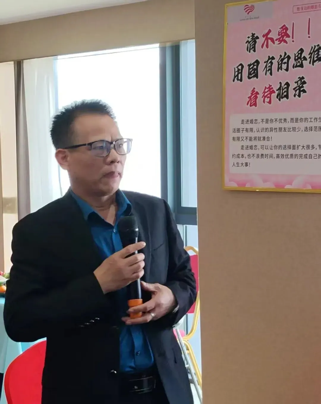 策划专家、汇爱婚恋负责人刘志军先生随后登场,他以风趣幽默的语言为大家详细介绍了“520 活动” 以及 “中茂城婚恋产业园” 项目。他的每一句话都仿佛带着魔力,如同一颗颗火种,点燃了与会者心中的激情。在他的描绘下,一个充满浪漫与希望的婚恋事业蓝图徐徐展开,让人不禁对未来充满了期待。“爱情不是等待风暴过去,而是学会在雨中翩翩起舞,我们的项目就是为大家搭建这样一个浪漫的舞台。” 刘志军先生的这句金句,更是赢得了满堂喝彩,将现场气氛推向了高潮。