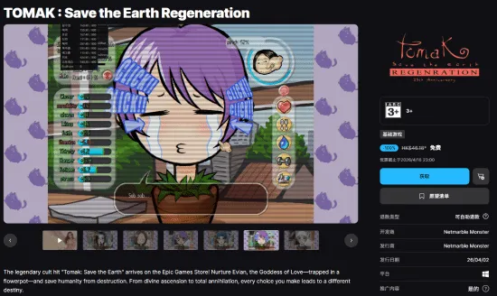 Netmarble Monster于4月2日宣布,由Seed9开发恋爱模拟游戏《TOMAK:Save the Earth Regeneration》现已登陆Epic Games商店,并开启限时免费领取活动。即日起至4月17日0点,玩家可免费将游戏添加至库中,永久拥有。