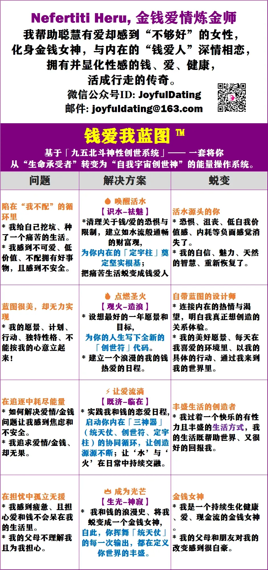 --- 关于我 --- Nefertiti Heru, 金钱爱情炼金师我帮助聪慧有爱却感到“不够好”的女性, 化身金钱女神,与内在的“钱爱人”深情相恋, 拥有并显化性感的钱、爱、健康, 活成行走的传奇。