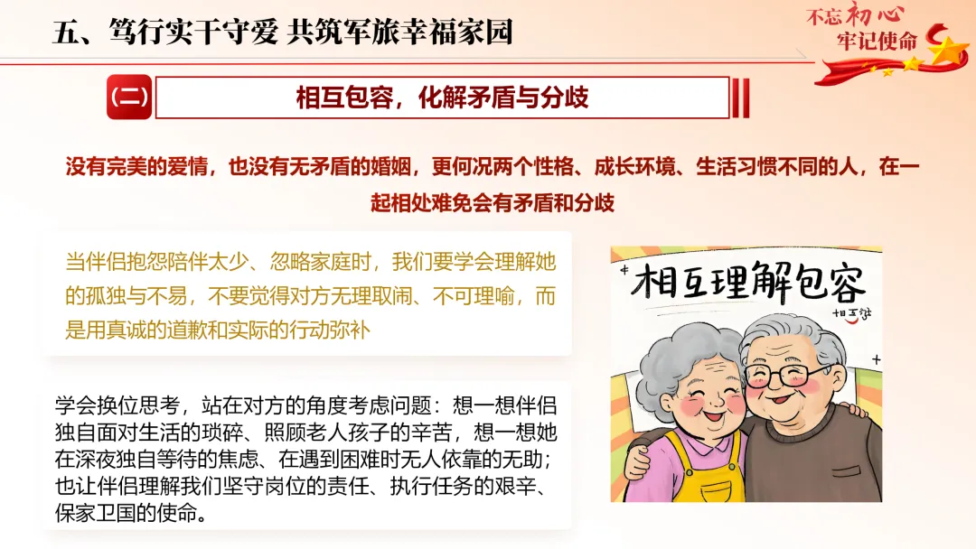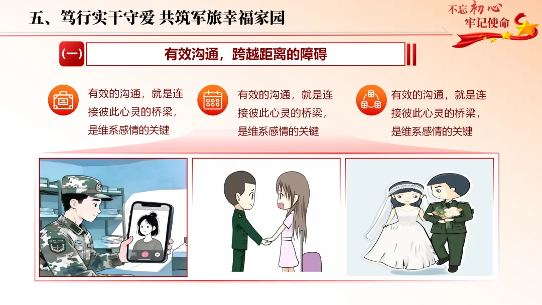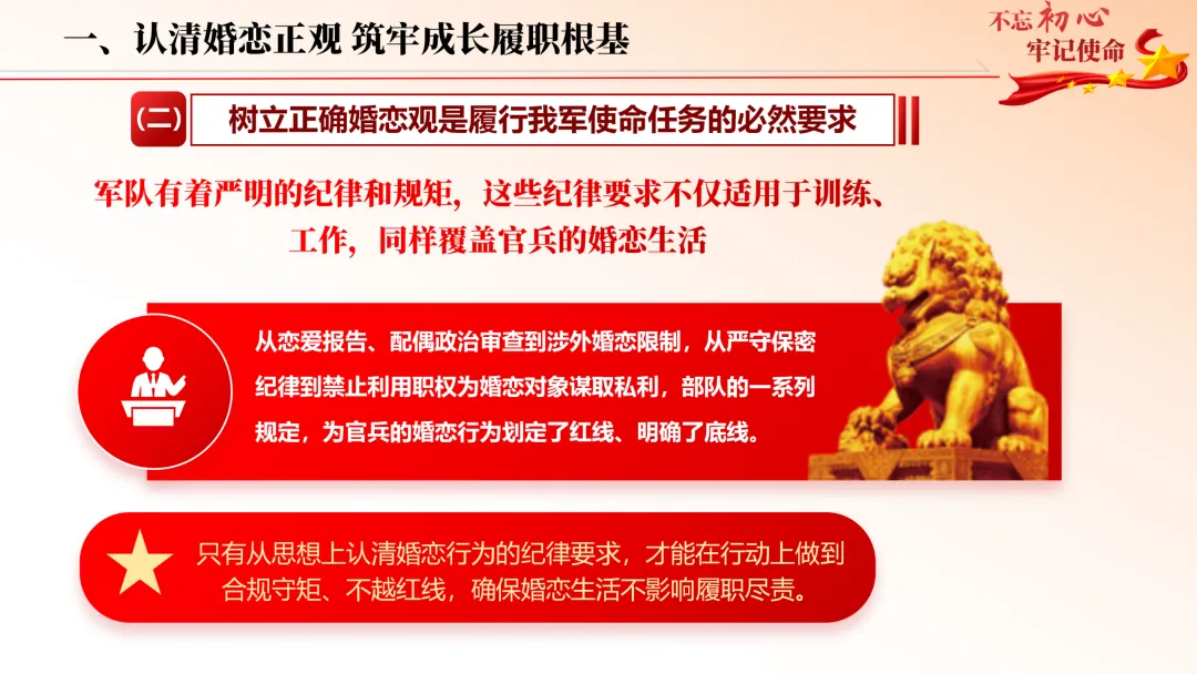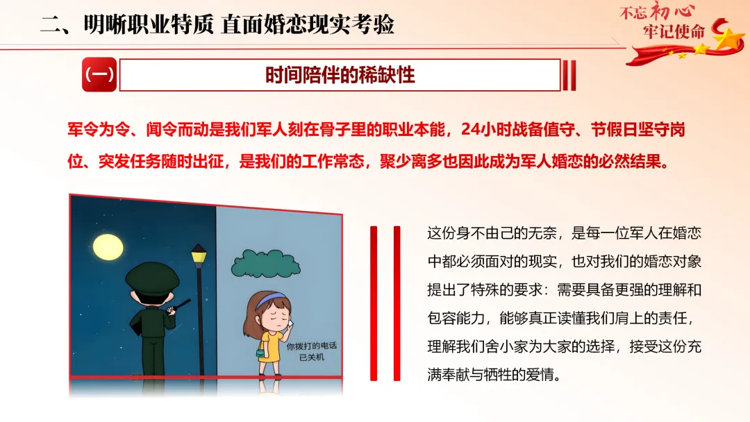 立足军人职业特殊性,直面陪伴稀缺、生活不确定、社交圈子受限等难题,以先辈烽火爱情为精神标杆,从树立正确婚恋观、直面现实考验、赓续榜样精神、严守纪律红线、用心经营爱情五大维度,全方位指引官兵找准人生 “对的人”。
