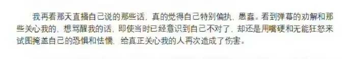 她一边哭一边鞠躬,情绪激动到说不出话,之后还在鱼吧发布了和直播内容一模一样的文字版道歉信,只不过这份“诚恳”的道歉,并没有换来粉丝的原谅。