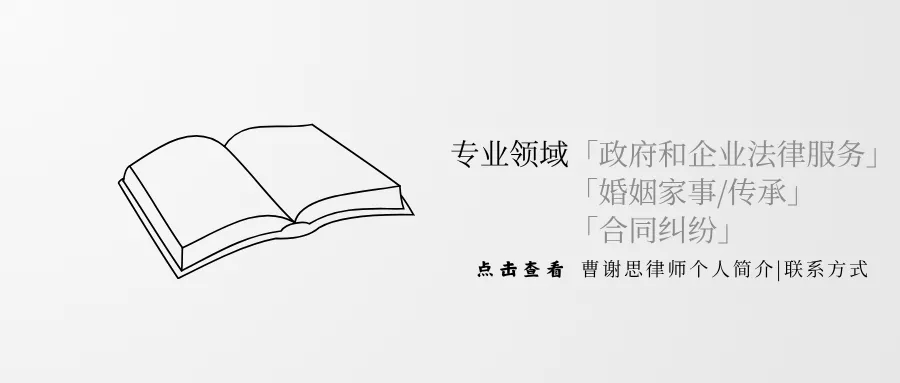 曹谢思,民商事律师,执业证号14301202210513446。主要业务领域包括但不限于政府和企业法律服务、婚姻家事/传承、合同纠纷等。联系电话:17343626988。