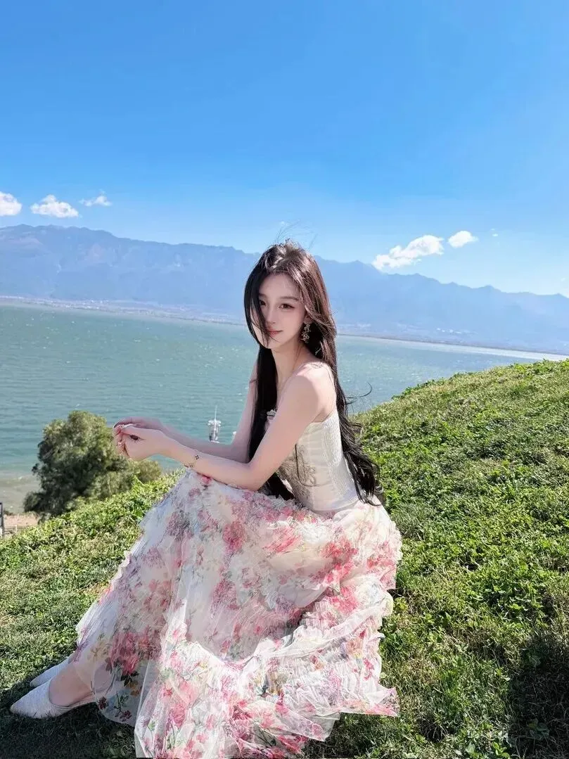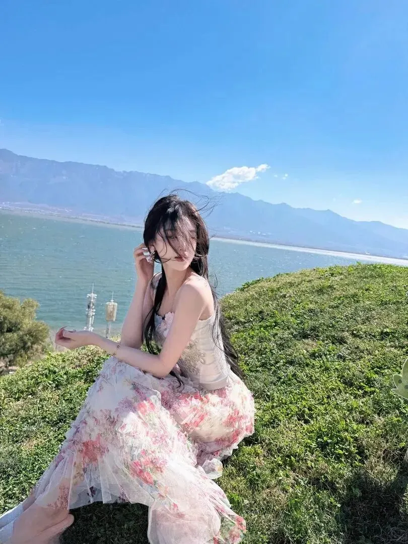 接下来介绍一下我最喜爱的一套湖畔造型。她挑选了粉色渐变的薄纱长裙,上面有各种各样的花卉图案,远远望去就像是春天的衣服。上衣为米白色蕾丝抹胸吊带,在其上部的上端处有两条不同的颜色(蓝色和米白两种),并且它们用缝纫线穿在一条线上的位置,形成了“双色”蕾丝效果,非常漂亮!总之这身穿着适合在湖边散步,它的飘带似人行于风景当中游曳。穿搭不需要太复杂,简单一些反而更治愈。