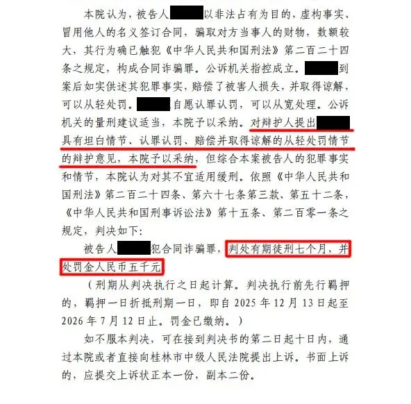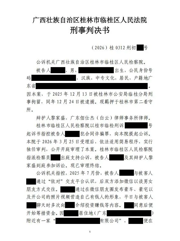 2025年12月,本所黎家盛律师接受委托,办结了一起婚恋型合同诈骗案。经黎律师的有效辩护,提出多项从轻处罚并建议适用缓刑的专业辩护意见,法院经审理充分采纳相关从轻辩护意见,对被告人依法从轻量刑,成功维护了当事人的合法权益。