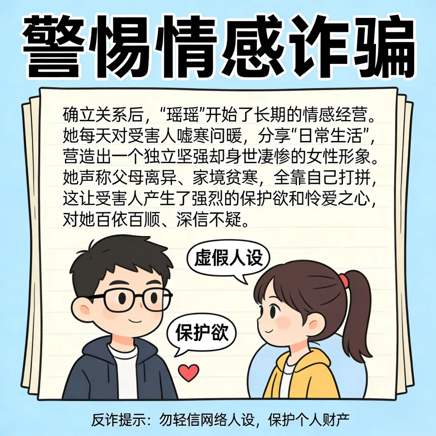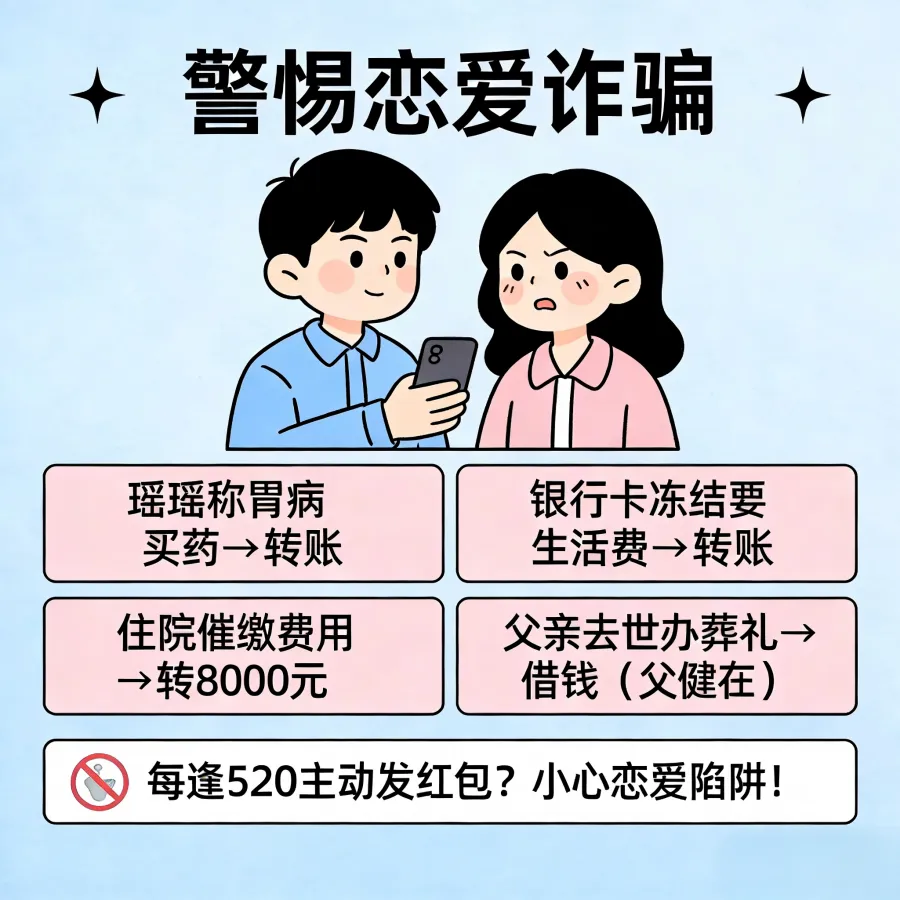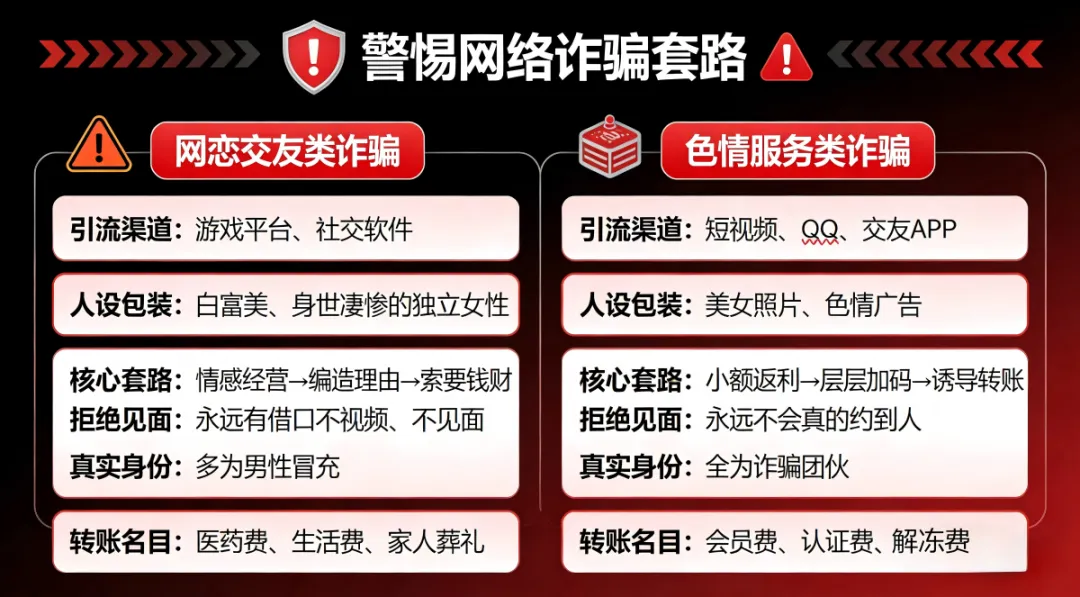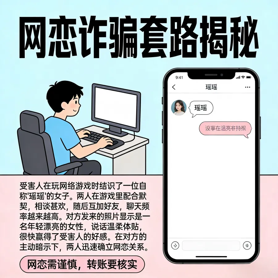 根据2025年公安厅发布的电诈受害群体画像,男性受骗人占比呈逐年上升趋势,其中网络婚恋交友类诈骗是男性被骗的高发类型,主要针对16-45岁男性群体。诈骗分子利用男性“家庭经济支柱”角色及易表现“过度自信”“保护欲”的心理,定制诈骗剧本。以下是基于真实案例整理的两类男性高发被骗场景的详细过程文案:一年多时间里,受害人累计向“女友”转账30多万元。期间,他多次提出见面或视频通话,但“瑶瑶”总是以“手机上交”“室友居住不便”“工作太忙”等理由推脱。随着怀疑逐渐加深,受害人最终选择报警。警方调查后发现,那个与他相恋一年多的“女友”,真实身份是一名26岁的男性。受害人转去的30多万元,已被对方全部挥霍一空,用于网络游戏充值和个人消费。受害人在一次次转账中越陷越深,等他终于意识到不对劲时,已经向对方账户转出了6万余元。而所谓的“美女见面”,从未兑现。网恋需谨慎,不见面不转钱:凡是素未谋面的网恋对象以各种理由借钱,十有八九是诈骗。务必通过视频、线下见面等方式核实对方真实身份。
