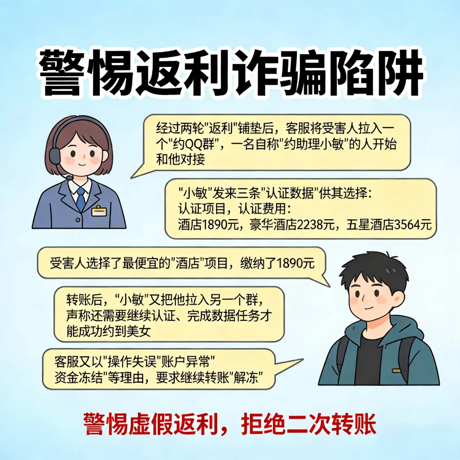 警惕“小额返利”诱饵:骗子常以“先返利”建立信任,再诱导大额转账。凡是要求“做任务”“刷数据”才能“约”的,都是诈骗。