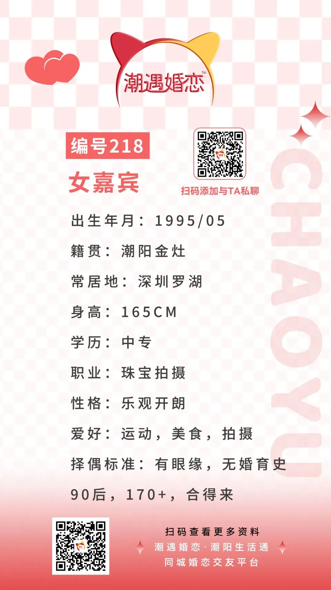 诚意想与嘉宾认识的可扫码联系潮遇红娘牵线,将本期嘉宾的编号/交友卡片发送给潮遇红娘,开启心动模式,与嘉宾微信聊天深入了解哟!
