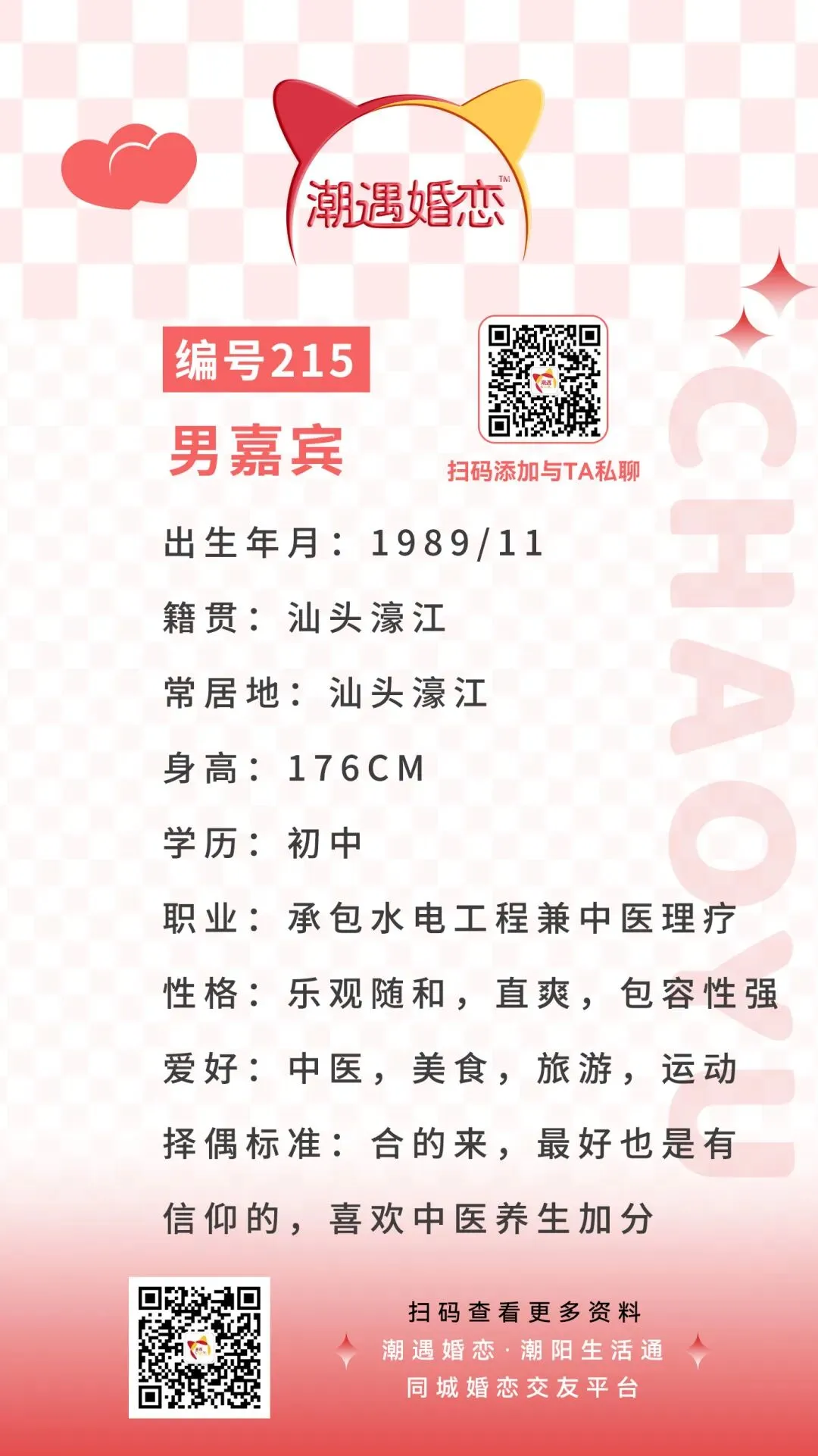 【潮遇婚恋】嘉宾:编号215号男嘉宾 · 常居深圳龙湖,爱好中医养生~