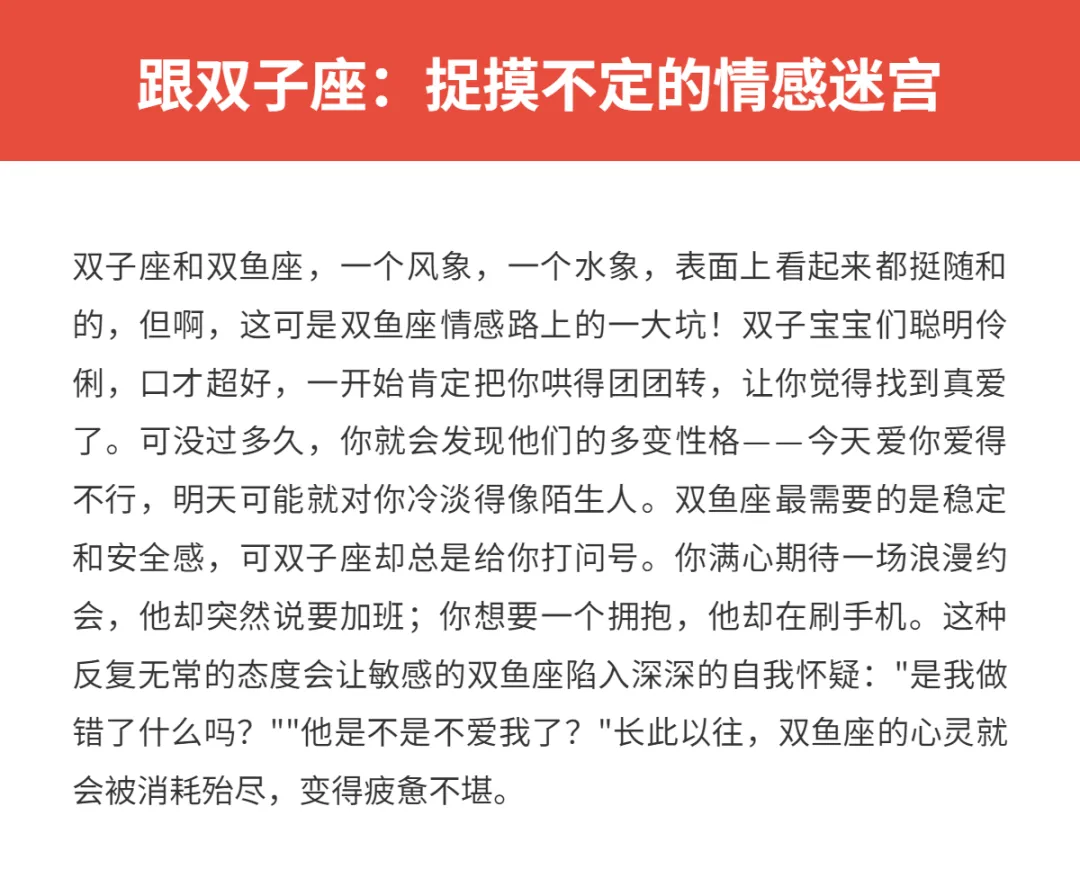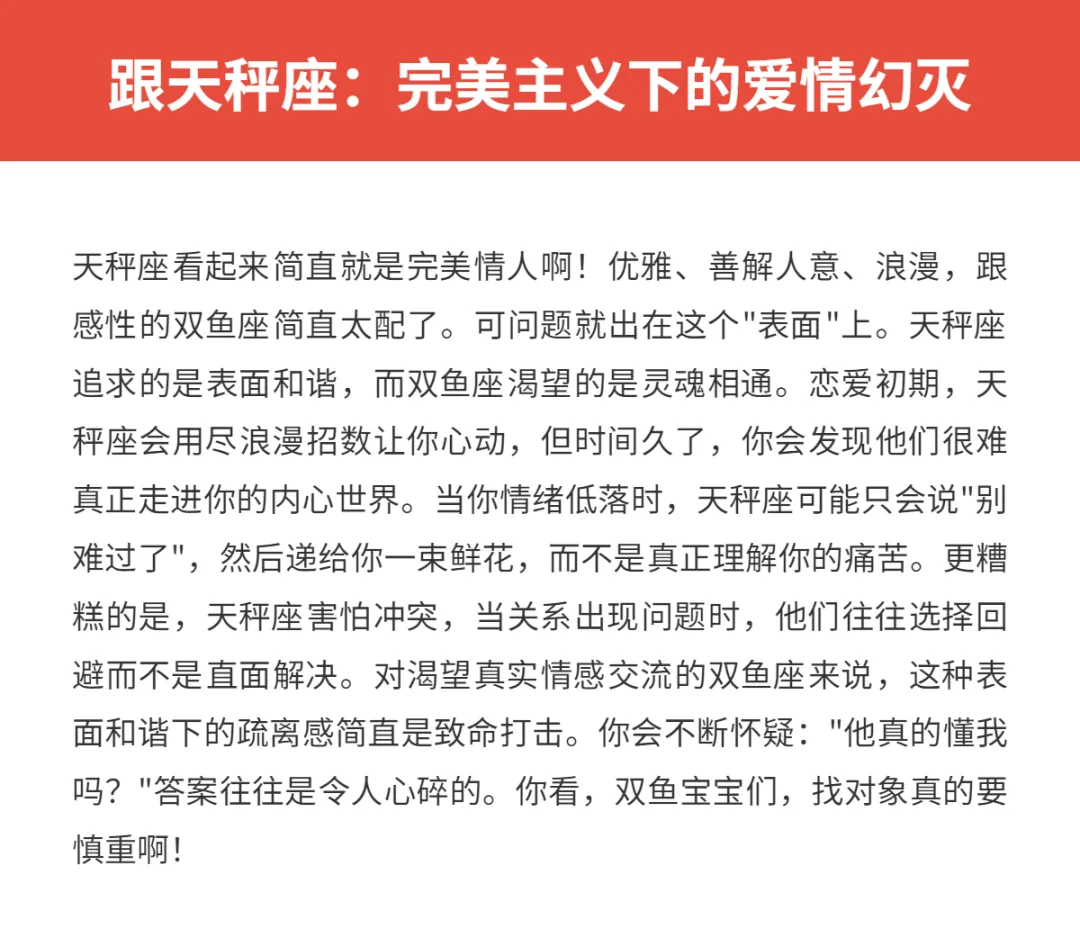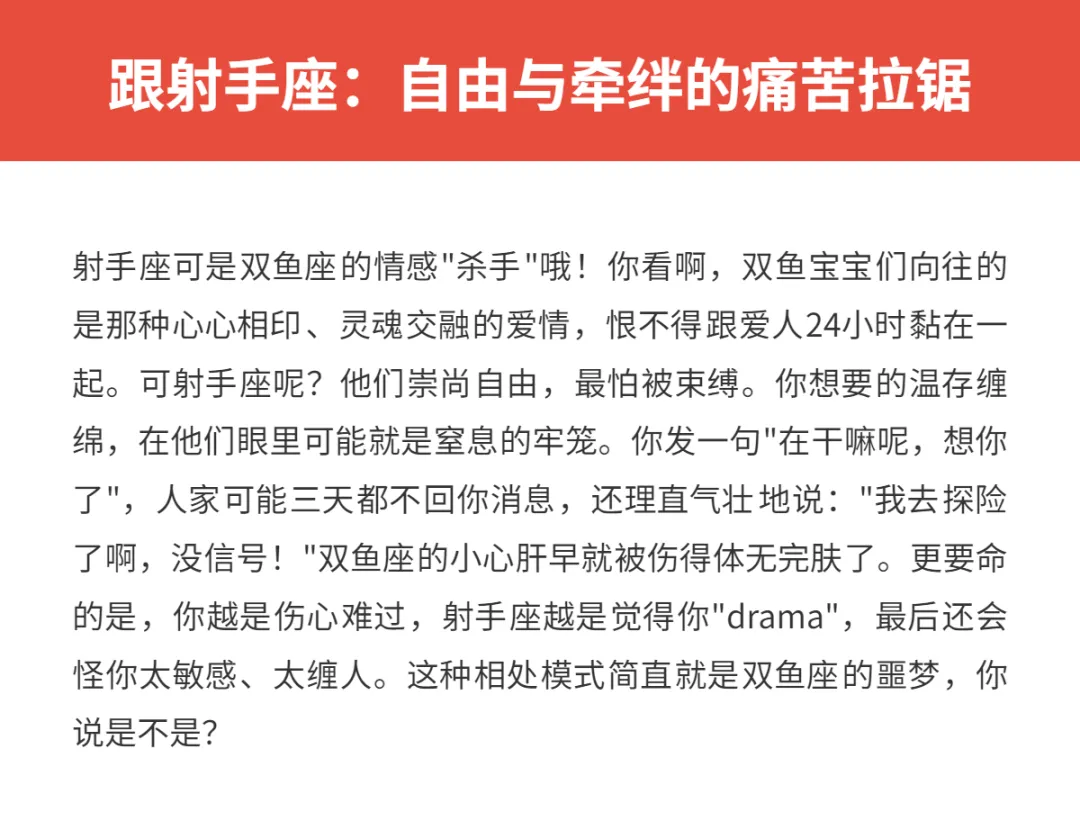 亲爱的双鱼座朋友们,你们是十二星座里最感性、最浪漫的星座,也是最容易在感情中受伤的那一个。你们像大海一样深邃,像诗歌一样美丽,可这份敏感多情却常常成为爱情路上的绊脚石。今天咱们就来聊聊,双鱼座跟哪些星座恋爱最容易受伤?你是不是也曾经因为爱错人而泪流满面?别担心,看完这篇文章,希望能帮你避开那些情感雷区,找到真正懂你的那个人!毕竟对双鱼座来说,一段真挚的感情比什么都重要,对不对?