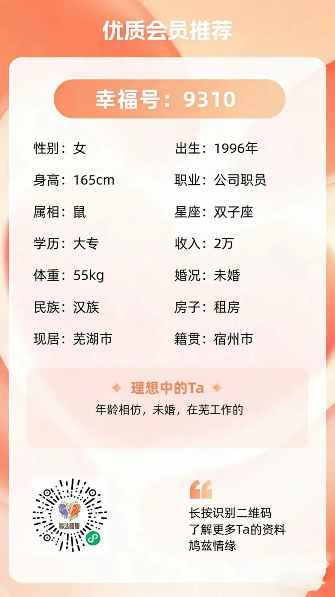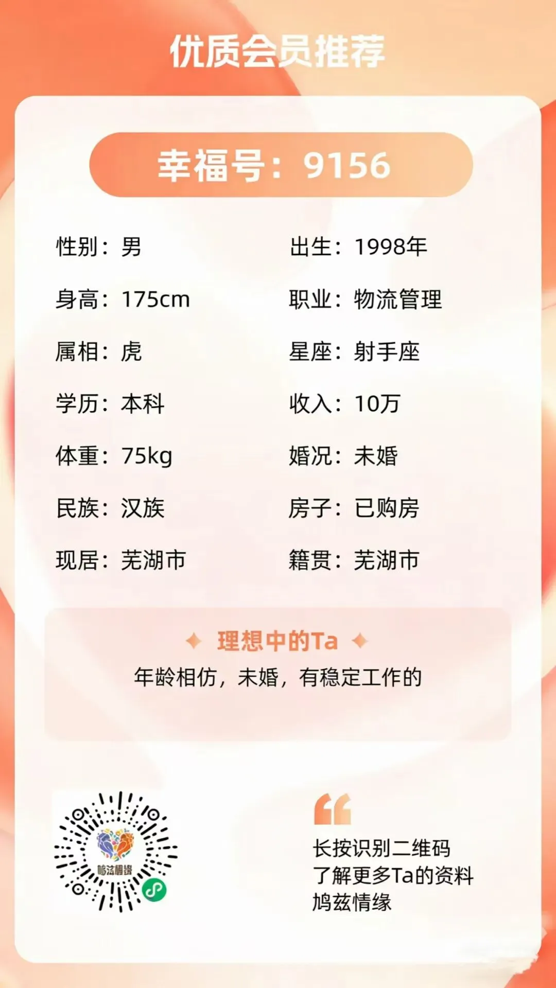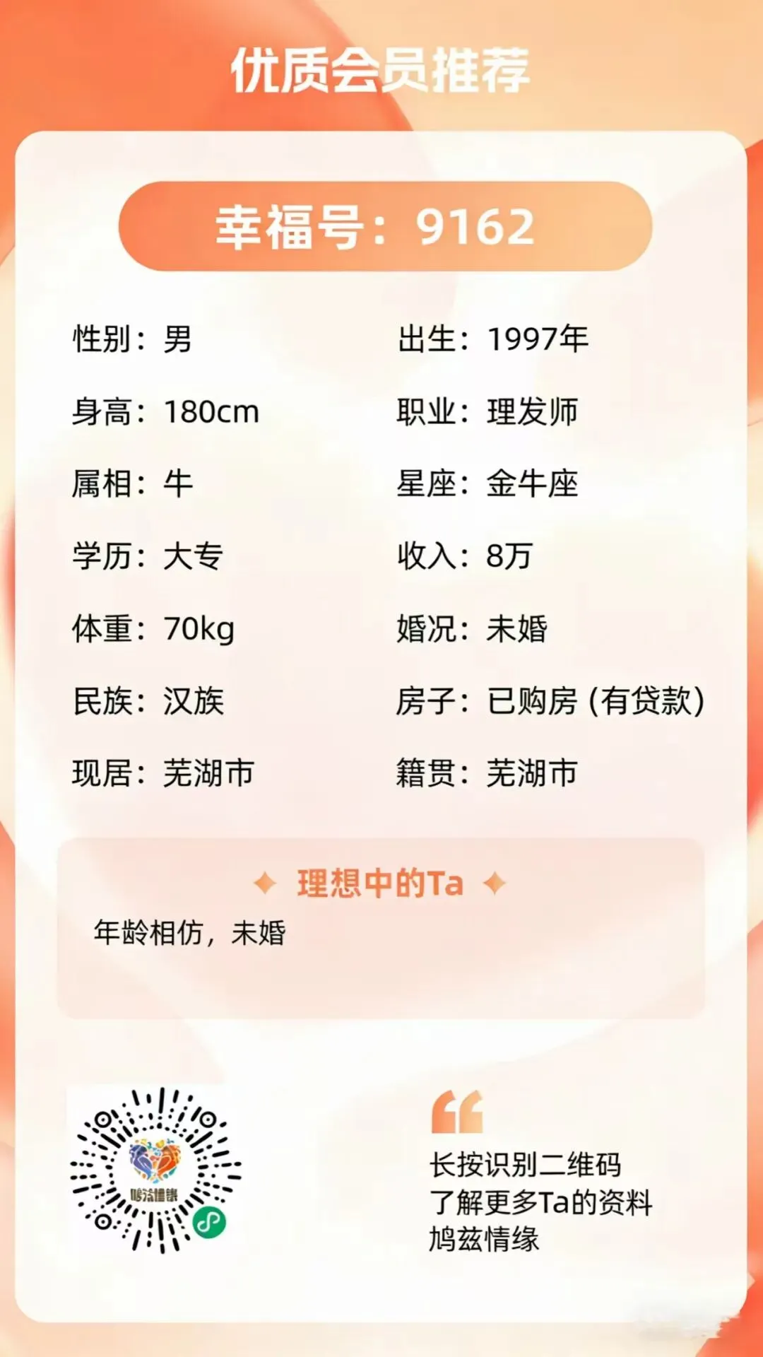 💘希望年龄相仿,未婚,有芜工作