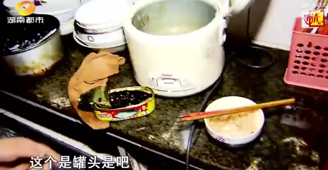 布满油渍的台面上,放着一罐剩下的鱼罐头和一碗米饭: