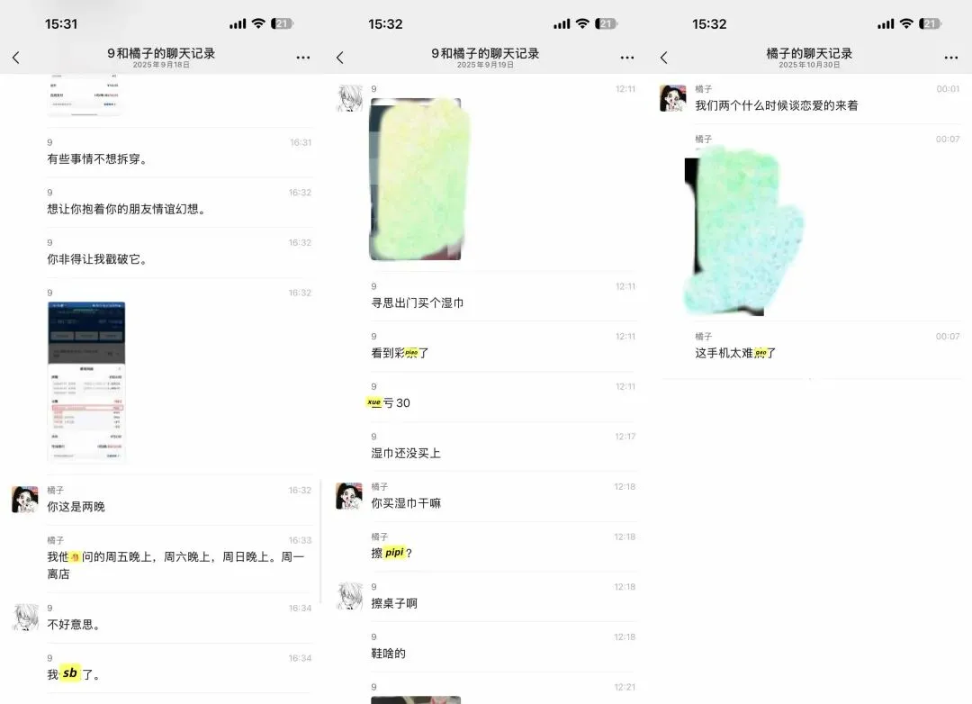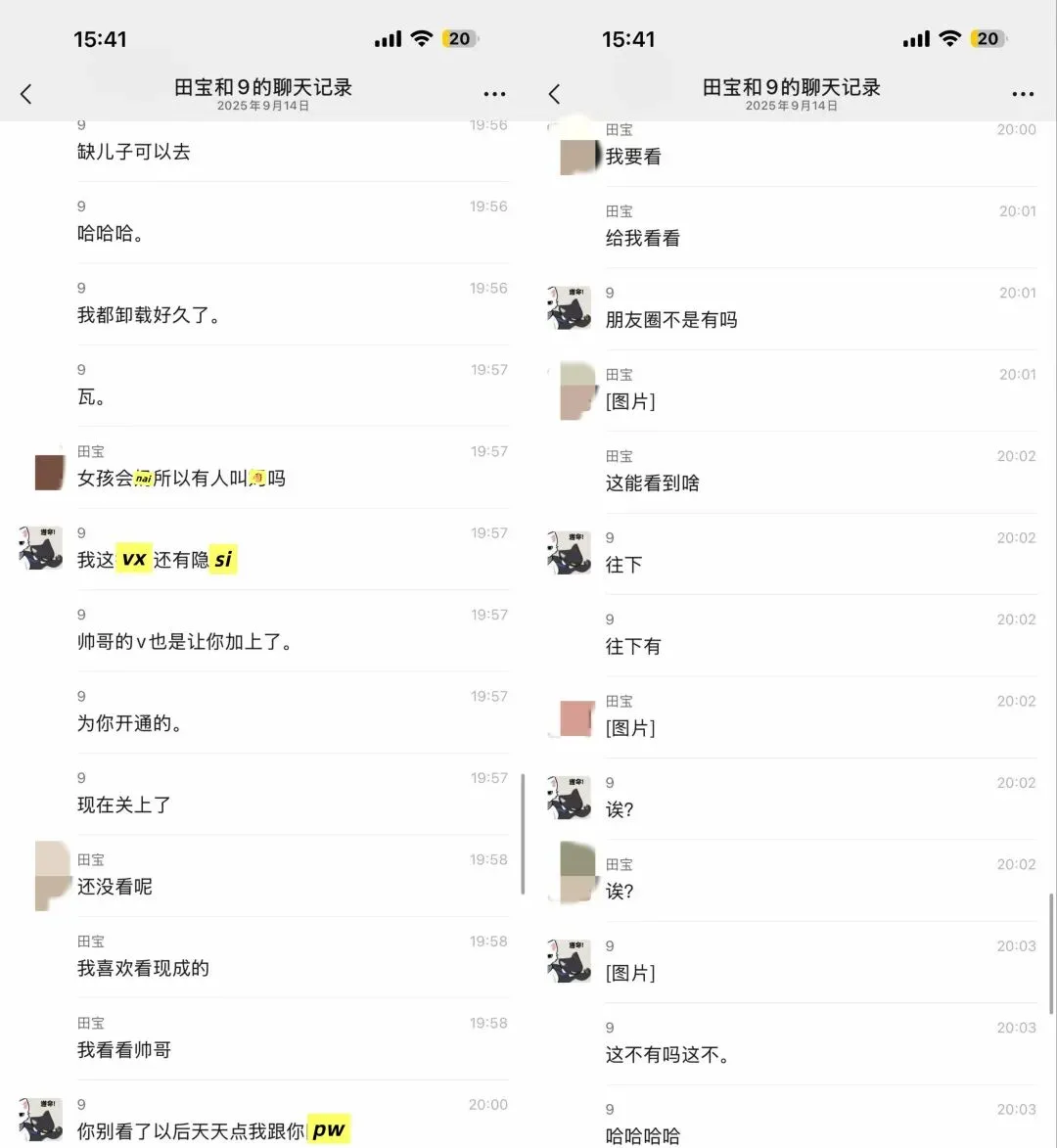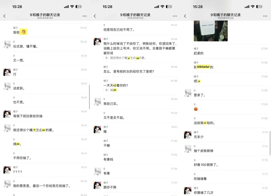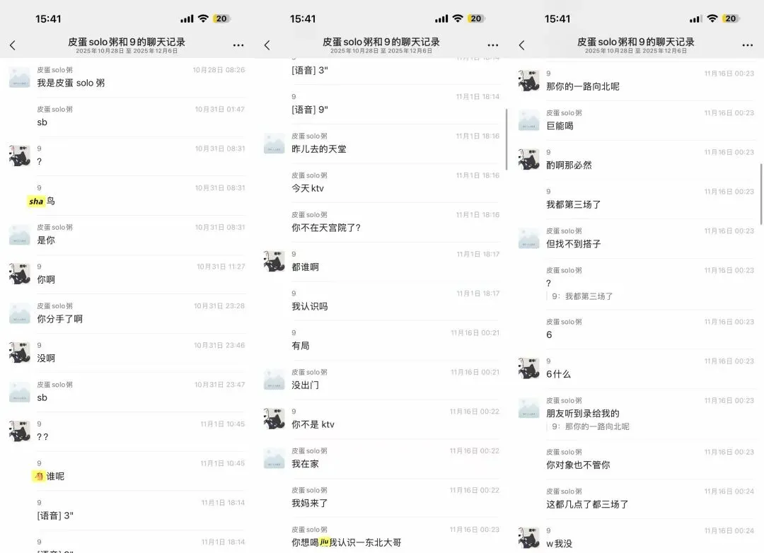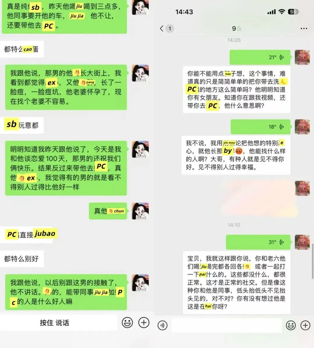 我一直ma他,男方的同事还准备带他去pc,说了让他别和这种人联系,不听,瞒着我和别人吃饭喝9。物以类聚人以群分。(他依旧在聊sao,哈哈哈哈哈哈哈)
