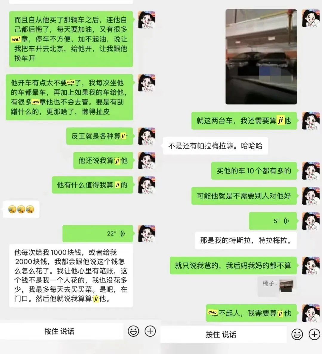 男方拿我的车和网友装b,说他买的。当时买车的时候他确实问了我月供多少钱,我说2800多。他说他给我还,他还得起。结果280都没哈哈哈哈哈哈哈哈。