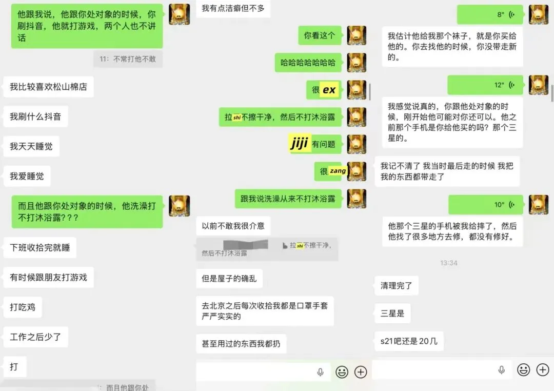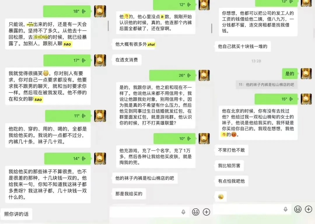 男方的前女友拿钱给他帮他的亲戚,拿钱带他去旅游。我给他买东西,他却拿前女友的袜子给我穿。你在我这立所谓的人设,满嘴慌话。